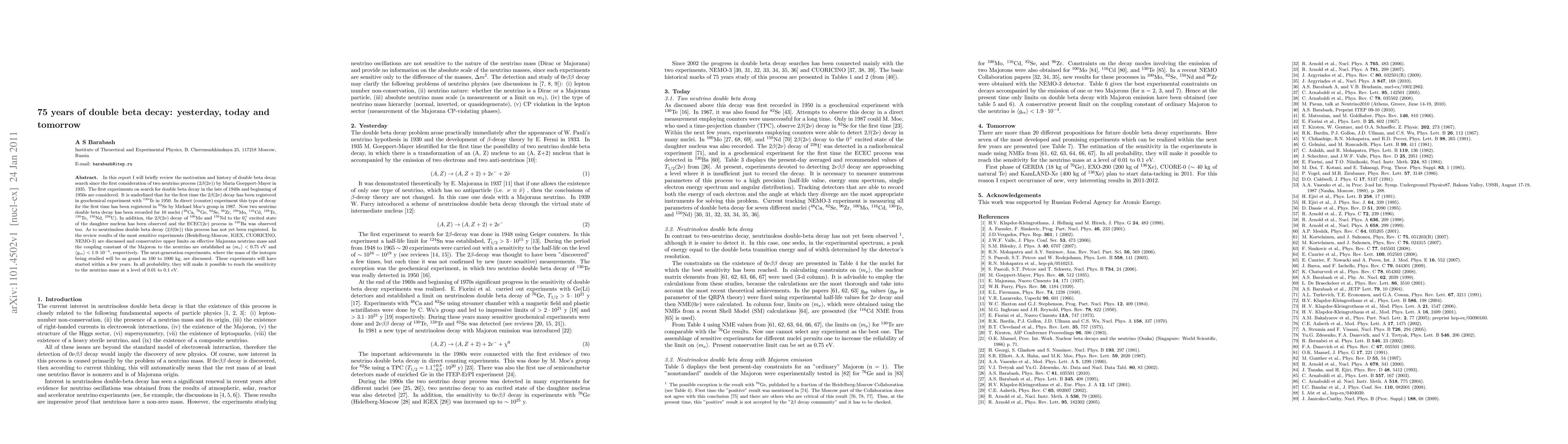Researchers have searched for double beta decay over 75 years, with recent experiments detecting it in 10 nuclei and setting conservative limits on effective Majorana neutrino mass and coupling constant. Next-generation experiments aim to reach sensitivity of 0.01-0.1 eV.