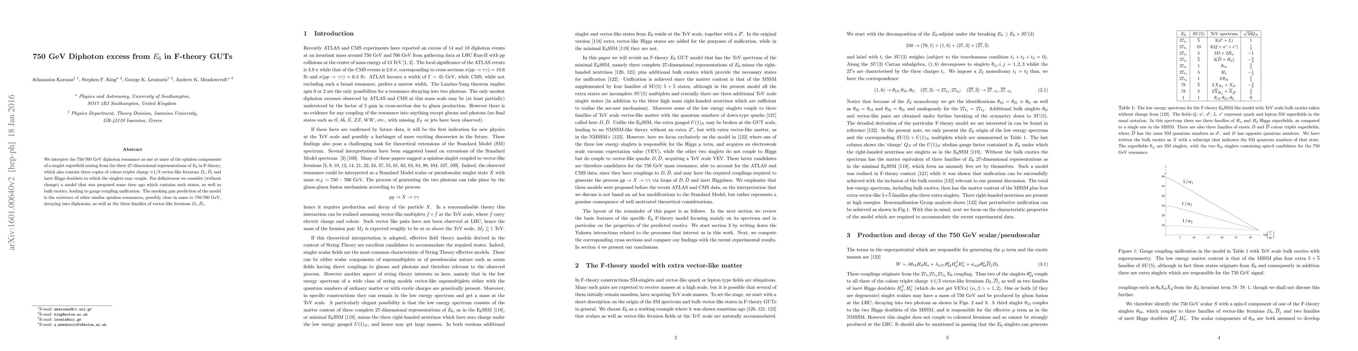 We interpret the 750-760 GeV diphoton resonance as one or more of the spinless components of a singlet superfield arising from the three 27-dimensional representations of $E_6$ in F-theory, which also contain three copies of colour-triplet charge $\mp 1/3$ vector-like fermions $D_i,\bar{D}_i$ and inert Higgs doublets to which the singlets may couple. For definiteness we consider (without change) a model that was proposed some time ago which contains such states, as well as bulk exotics, leading to gauge coupling unification. The smoking gun prediction of the model is the existence of other similar spinless resonances, possibly close in mass to 750-760 GeV, decaying into diphotons, as well as the three families of vector-like fermions $D_i,\bar{D}_i$.