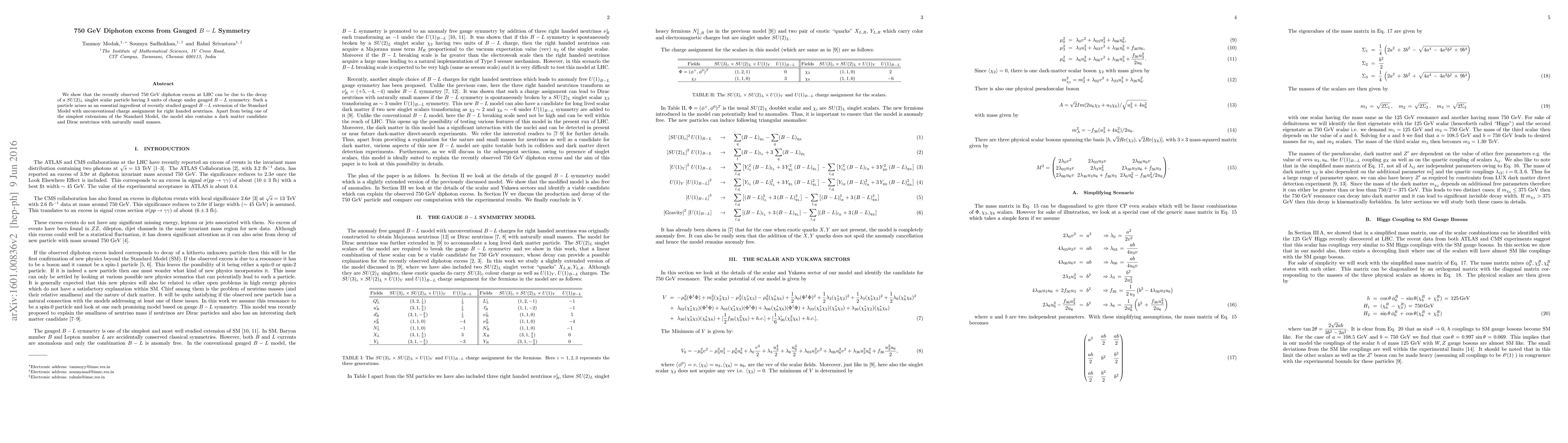 The paper proposes that the 750 GeV diphoton excess observed at the LHC is caused by the decay of a $SU(2)_L$ singlet scalar in a gauged $B-L$ symmetry extension of the Standard Model, which also naturally accommodates dark matter and Dirac neutrinos.