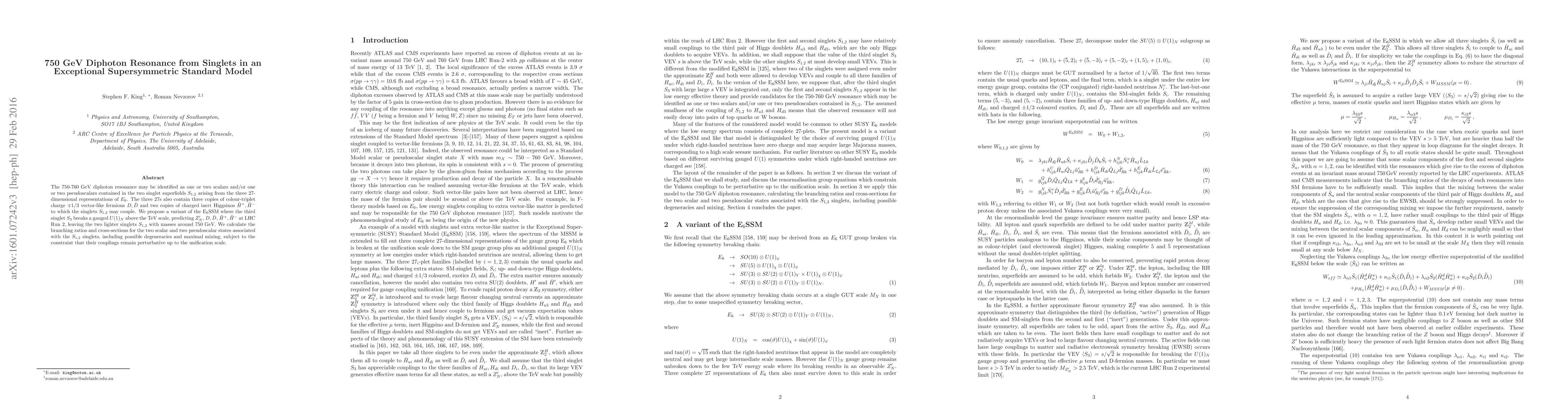 The 750-760 GeV diphoton resonance may be identified as one or two scalars and/or one or two pseudoscalars contained in the two singlet superfields S_{1,2} arising from the three 27-dimensional representations of E_6 . The three 27s also contain three copies of colour-triplet charge \mp 1/3 vector-like fermions D,\bar{D} and two copies of charged inert Higgsinos \tilde{H}^{+},\tilde{H}^{-} to which the singlets S_{1,2} may couple. We propose a variant of the E_6SSM where the third singlet S_3 breaks a gauged U(1)_N above the TeV scale, predicting Z'_N, D,\bar{D}, \tilde{H}^{+},\tilde{H}^{-} at LHC Run 2, leaving the two lighter singlets S_{1,2} with masses around 750 GeV. We calculate the branching ratios and cross-sections for the two scalar and two pseudoscalar states associated with the S_{1,2} singlets, including possible degeneracies and maximal mixing, subject to the constraint that their couplings remain perturbative up to the unification scale.
