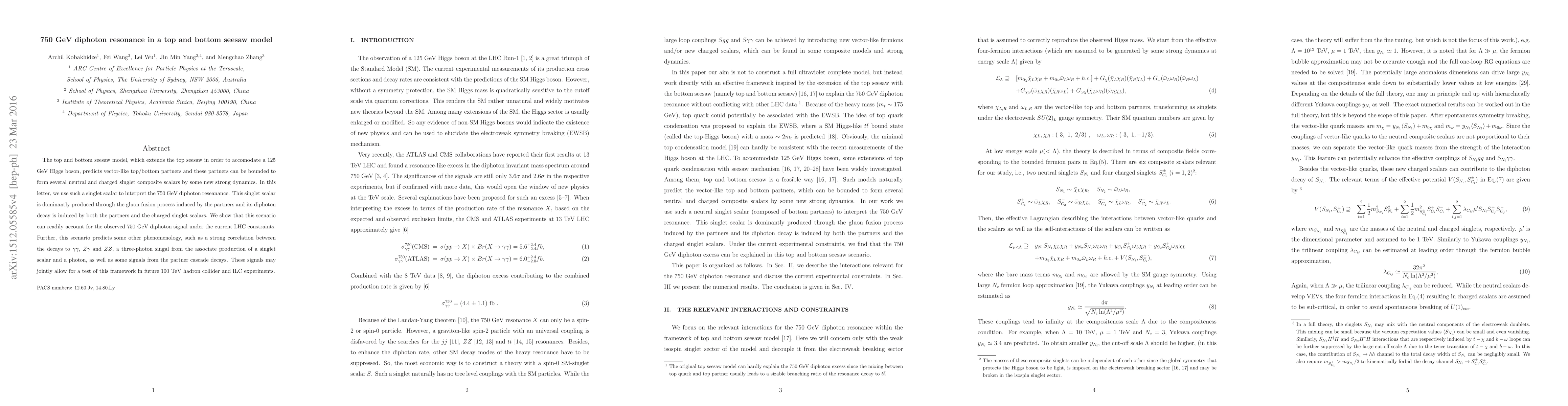 This paper proposes a top/bottom seesaw model to explain the 750 GeV diphoton resonance, utilizing a singlet scalar produced via gluon fusion and decaying into diphotons through top/bottom partners and charged singlet scalars. The model predicts additional phenomena like correlations between $\gamma\gamma$, $Z\gamma$, and $ZZ$ decays, a three-photon signal, and partner cascade decays, which could be tested at future LHC and ILC experiments.