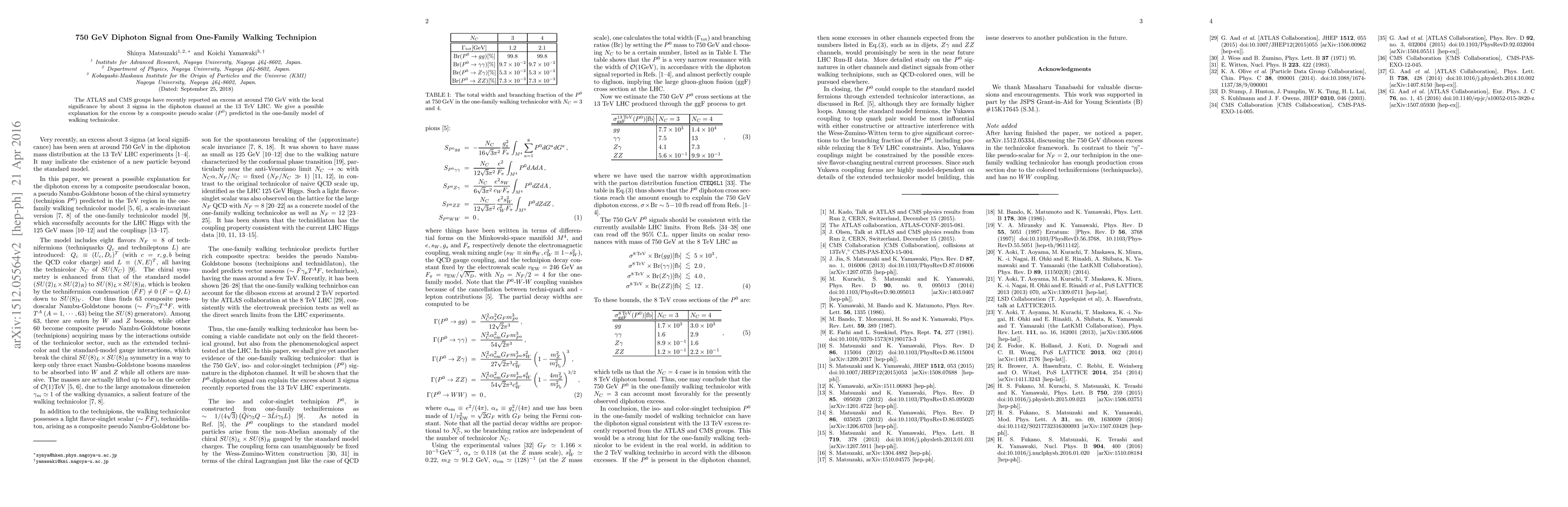 The ATLAS and CMS groups have recently reported an excess at around 750 GeV with the local significance by about 3 sigma in the diphoton channel at the 13 TeV LHC. We give a possible explanation for the excess by a composite pseudo scalar $(P^0)$ predicted in the one-family model of walking technicolor.