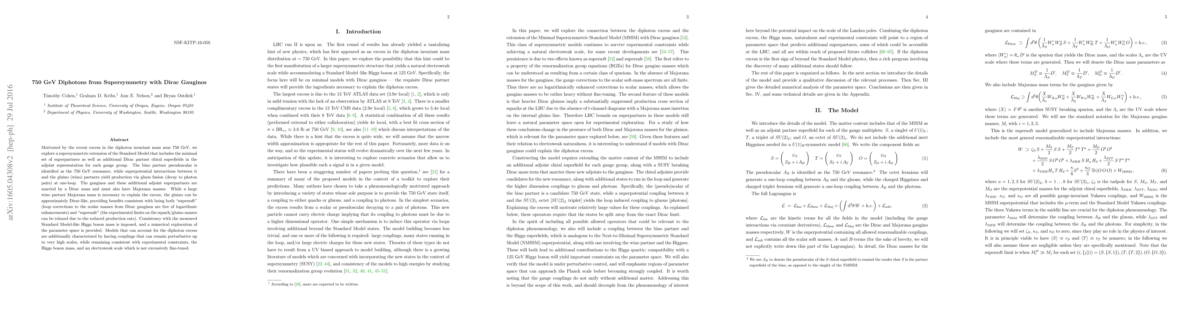 Motivated by the recent excess in the diphoton invariant mass near 750 GeV, we explore a supersymmetric extension of the Standard Model that includes the minimal set of superpartners as well as additional Dirac partner chiral superfields in the adjoint representation for each gauge group. The bino partner pseudoscalar is identified as the 750 GeV resonance, while superpotential interactions between it and the gluino (wino) partners yield production via gluon fusion (decay to photon pairs) at one-loop. The gauginos and these additional adjoint superpartners are married by a Dirac mass and must also have Majorana masses. While a large wino partner Majorana mass is necessary to explain the excess, the gluino can be approximately Dirac-like, providing benefits consistent with being both "supersoft" (loop corrections to the scalar masses from Dirac gauginos are free of logarithmic enhancements) and "supersafe" (the experimental limits on the squark/gluino masses can be relaxed due to the reduced production rate). Consistency with the measured Standard Model-like Higgs boson mass is imposed, and a numerical exploration of the parameter space is provided. Models that can account for the diphoton excess are additionally characterized by having couplings that can remain perturbative up to very high scales, while remaining consistent with experimental constraints, the Higgs boson mass, and an electroweak scale which is not excessively fine tuned.