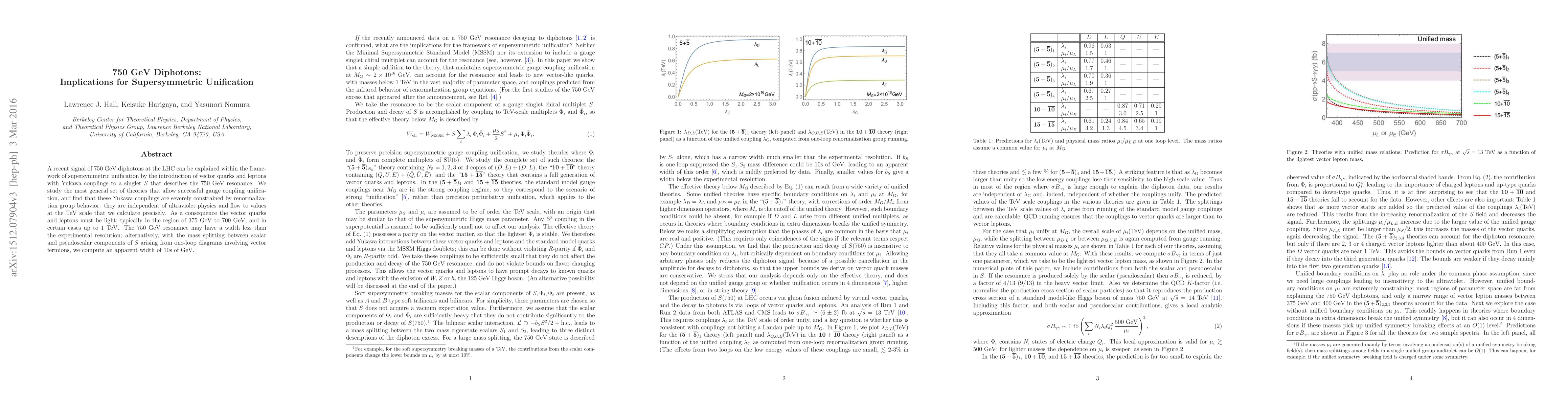 This paper explores how a 750 GeV diphoton signal at the LHC can be explained through supersymmetric unification, introducing vector quarks and leptons. The study finds that Yukawa couplings constrain these vector particles to be light, typically between 375 GeV and 700 GeV, with potential widths influenced by mass splittings from one-loop diagrams.