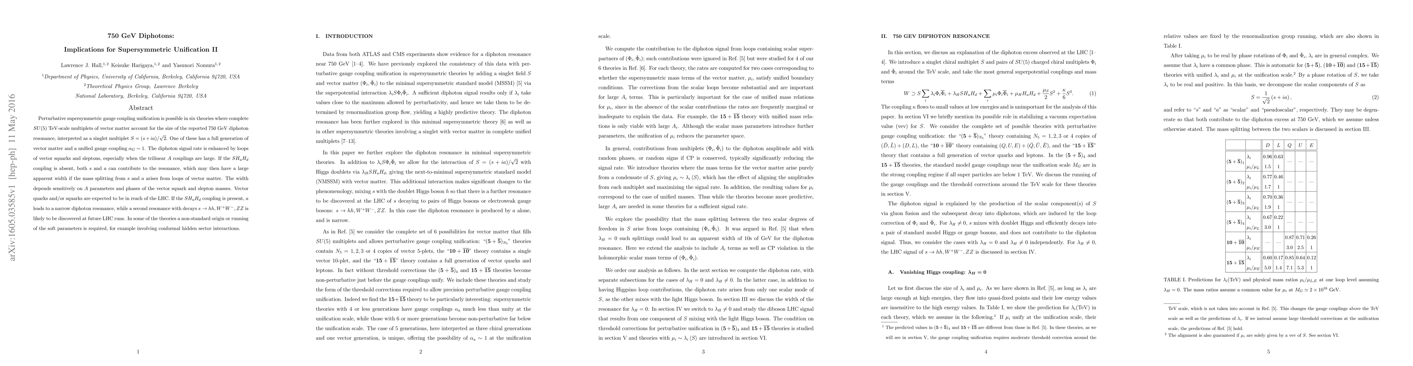 Perturbative supersymmetric gauge coupling unification is possible in six theories where complete SU(5) TeV-scale multiplets of vector matter account for the size of the reported $750~{\rm GeV}$ diphoton resonance, interpreted as a singlet multiplet $S = (s+ia)/\sqrt{2}$. One of these has a full generation of vector matter and a unified gauge coupling $\alpha_G \sim 1$. The diphoton signal rate is enhanced by loops of vector squarks and sleptons, especially when the trilinear $A$ couplings are large. If the $SH_u H_d$ coupling is absent, both $s$ and $a$ can contribute to the resonance, which may then have a large apparent width if the mass splitting from $s$ and $a$ arises from loops of vector matter. The width depends sensitively on $A$ parameters and phases of the vector squark and slepton masses. Vector quarks and/or squarks are expected to be in reach of the LHC. If the $SH_uH_d$ coupling is present, $a$ leads to a narrow diphoton resonance, while a second resonance with decays $s \rightarrow hh, W^+ W^-,ZZ$ is likely to be discovered at future LHC runs. In some of the theories a non-standard origin or running of the soft parameters is required, for example involving conformal hidden sector interactions.