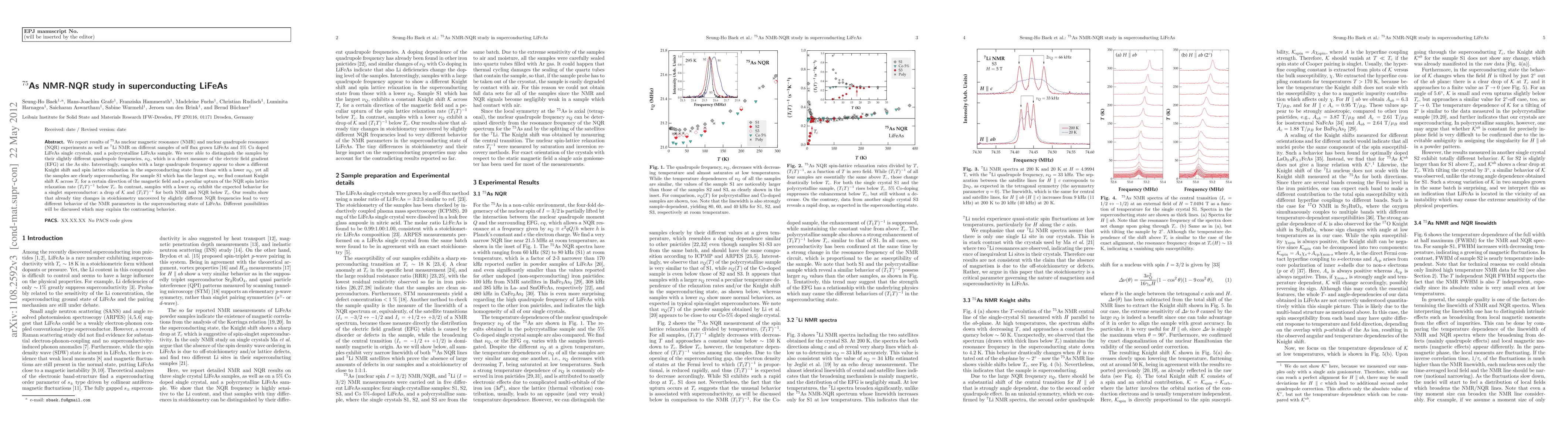 The study investigates 75As NMR-NQR and 7Li NMR on LiFeAs and Co-doped LiFeAs, revealing that samples with higher electric field gradients show unusual Knight shift and relaxation rate behaviors in the superconducting state compared to those with lower gradients, highlighting the sensitivity of superconducting properties to sample stoichiometry.