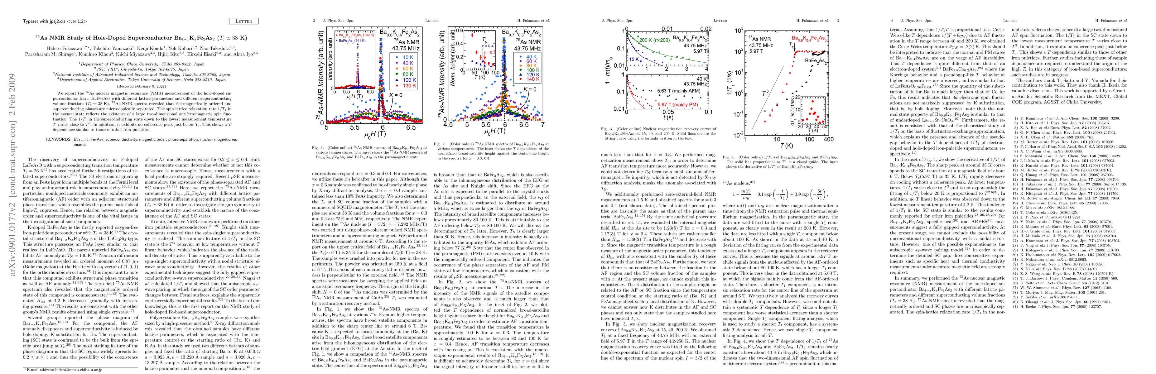 Researchers studied a superconductor Ba1-xKxFe2As2 using 75As NMR spectroscopy, finding that the magnetically ordered and superconducting phases are separated at the microscopic level. The study reveals a unique T dependence in the spin-lattice relaxation rate similar to other iron pnictides.