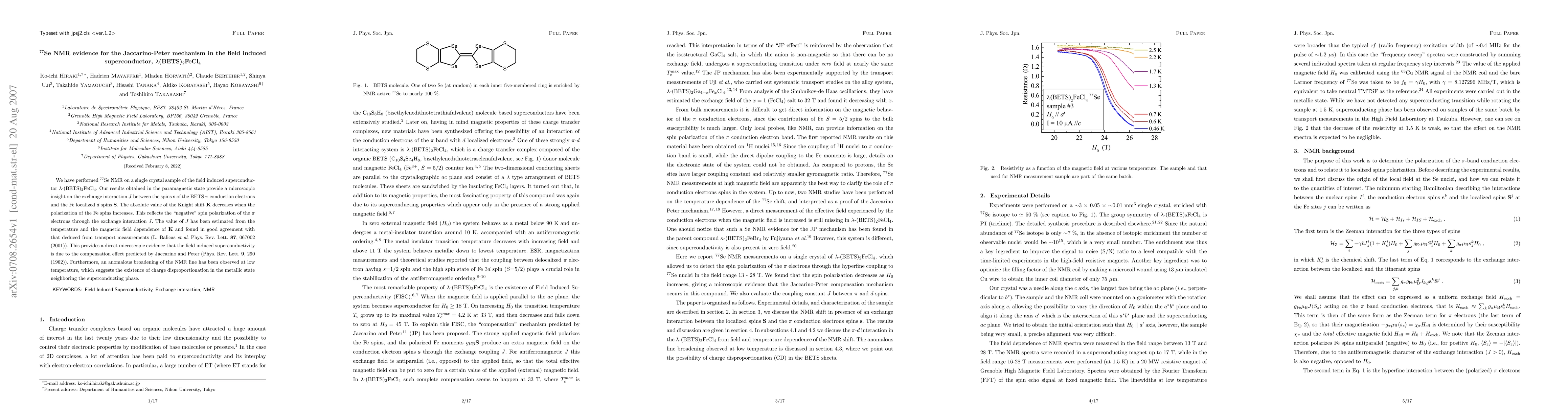 We have performed $^{77}$Se NMR on a single crystal sample of the field induced superconductor $\lambda$-(BETS)$_{2}$FeCl$_{4}$. Our results obtained in the paramagnetic state provide a microscopic insight on the exchange interaction $J$ between the spins \textbf{s} of the BETS $\pi$ conduction electrons and the Fe localized $d$ spins \textbf{S}. The absolute value of the Knight shift \textbf{K} decreases when the polarization of the Fe spins increases. This reflects the ``negative'' spin polarization of the $\pi$ electrons through the exchange interaction $J$. The value of $J$ has been estimated from the temperature and the magnetic field dependence of \textbf{K} and found in good agreement with that deduced from transport measurements (L. Balicas \textit{et al}. Phys. Rev. Lett. \textbf{87}, 067002 (2001)). This provides a direct microscopic evidence that the field induced superconductivity is due to the compensation effect predicted by Jaccarino and Peter (Phys. Rev. Lett. \textbf{9}, 290 (1962)). Furthermore, an anomalous broadening of the NMR line has been observed at low temperature, which suggests the existence of charge disproportionation in the metallic state neighboring the superconducting phase.