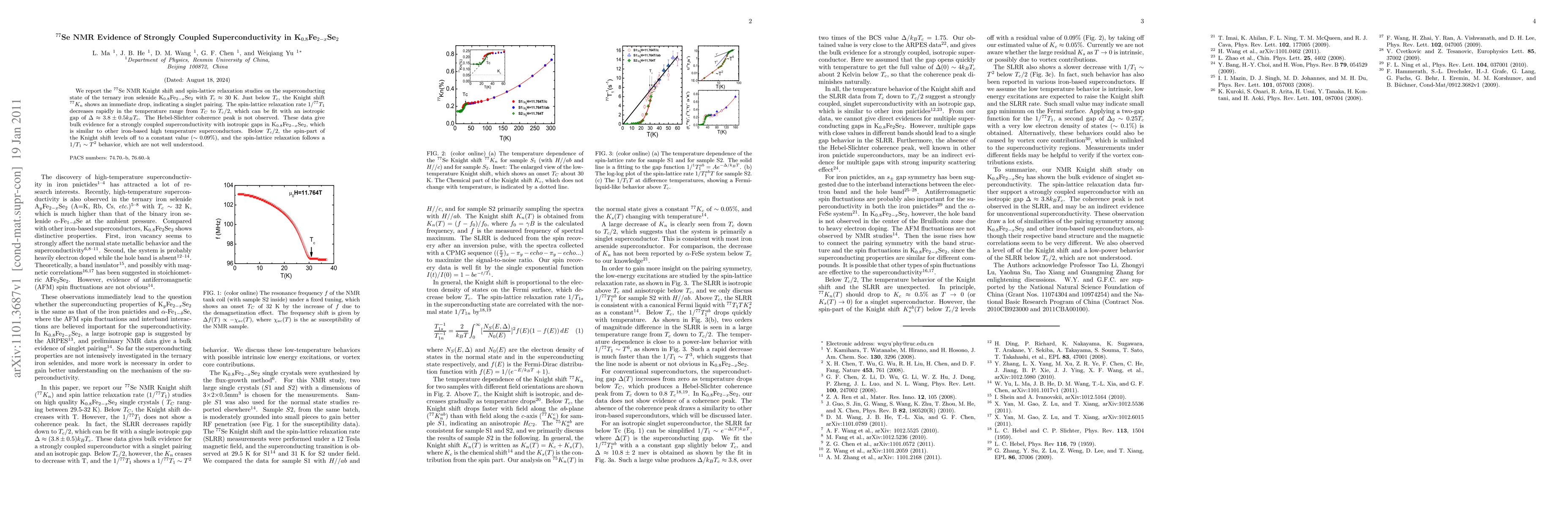 Researchers found evidence of strongly coupled superconductivity in K0.8Fe2-xSe2 with a temperature of around 30K, indicating a singlet pairing and isotropic gap.