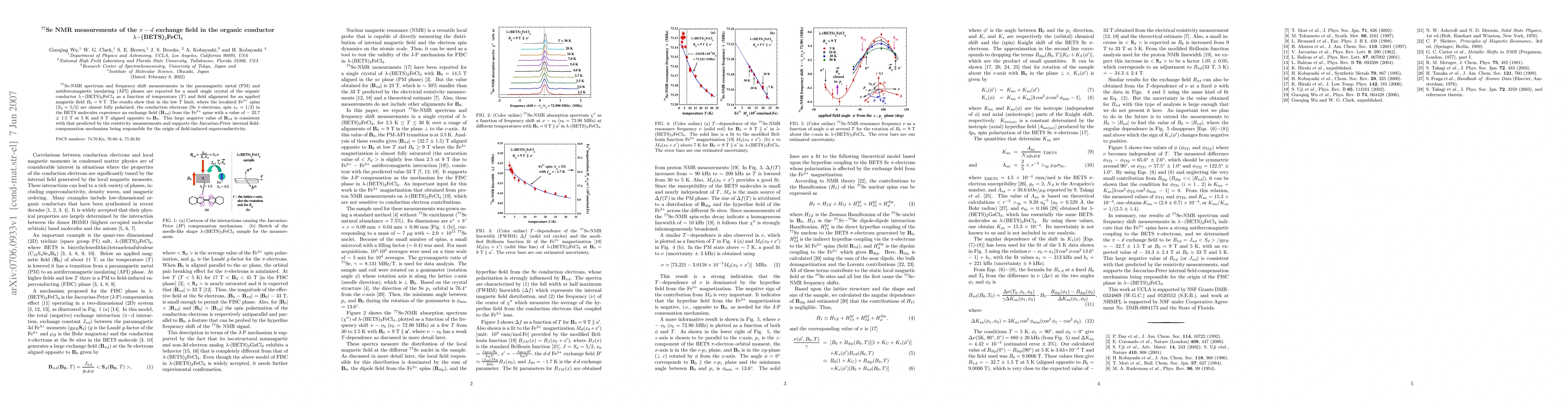 $^{77}$Se-NMR spectrum and frequency shift measurements in the paramagnetic metal (PM) and antiferromagnetic insulating (AFI) phases are reported for a small single crystal of the organic conductor $\lambda-$(BETS)$_{2}$FeCl$_{4}$ as a function of temperature ($T$) and field alignment for an applied magnetic field $B_{0}$ = 9 T. The results show that in the low $T$ limit, where the localized Fe$^{3+}$ spins ($S_{d}$ = 5/2) are almost fully polarized, the conduction electrons (Se $\pi$-electrons, spin $s_{\pi}$ = 1/2) in the BETS molecules experience an exchange field ($\bf{B}$$_{\pi d}$) from the Fe$^{3+}$ spins with a value of $-$ 32.7 $\pm$ 1.5 T at 5 K and 9 T aligned opposite to $\bf{B}$$_{0}$. This large negative value of $\bf{B}$$_{\pi d}$ is consistent with that predicted by the resistivity measurements and supports the Jaccarino-Peter internal field-compensation mechanism being responsible for the origin of field-induced superconductivity.