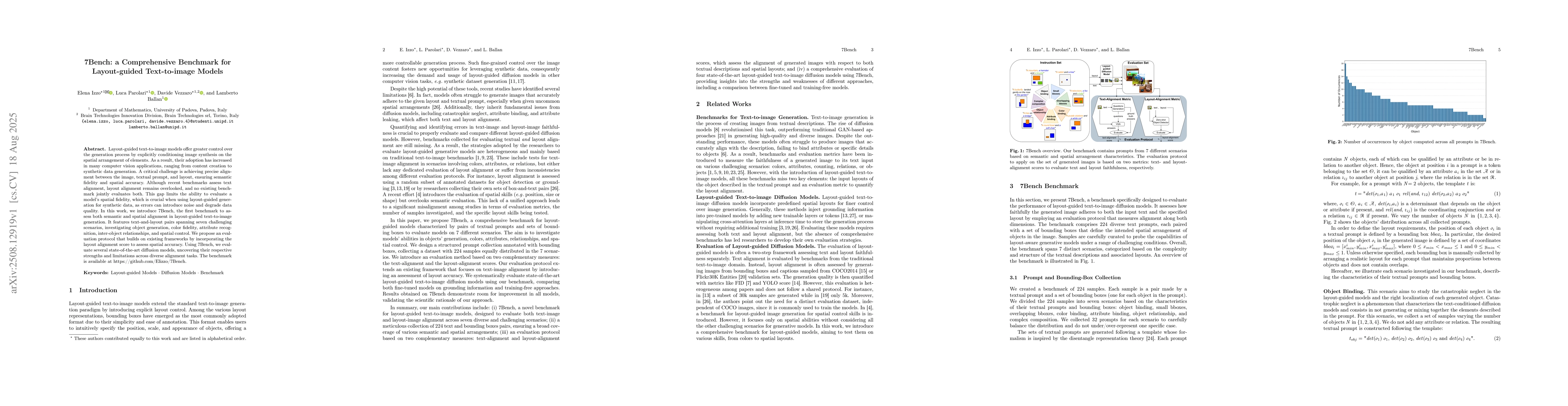 Layout-guided text-to-image models offer greater control over the generation process by explicitly conditioning image synthesis on the spatial arrangement of elements. As a result, their adoption has increased in many computer vision applications, ranging from content creation to synthetic data generation. A critical challenge is achieving precise alignment between the image, textual prompt, and layout, ensuring semantic fidelity and spatial accuracy. Although recent benchmarks assess text alignment, layout alignment remains overlooked, and no existing benchmark jointly evaluates both. This gap limits the ability to evaluate a model's spatial fidelity, which is crucial when using layout-guided generation for synthetic data, as errors can introduce noise and degrade data quality. In this work, we introduce 7Bench, the first benchmark to assess both semantic and spatial alignment in layout-guided text-to-image generation. It features text-and-layout pairs spanning seven challenging scenarios, investigating object generation, color fidelity, attribute recognition, inter-object relationships, and spatial control. We propose an evaluation protocol that builds on existing frameworks by incorporating the layout alignment score to assess spatial accuracy. Using 7Bench, we evaluate several state-of-the-art diffusion models, uncovering their respective strengths and limitations across diverse alignment tasks. The benchmark is available at https://github.com/Elizzo/7Bench.
