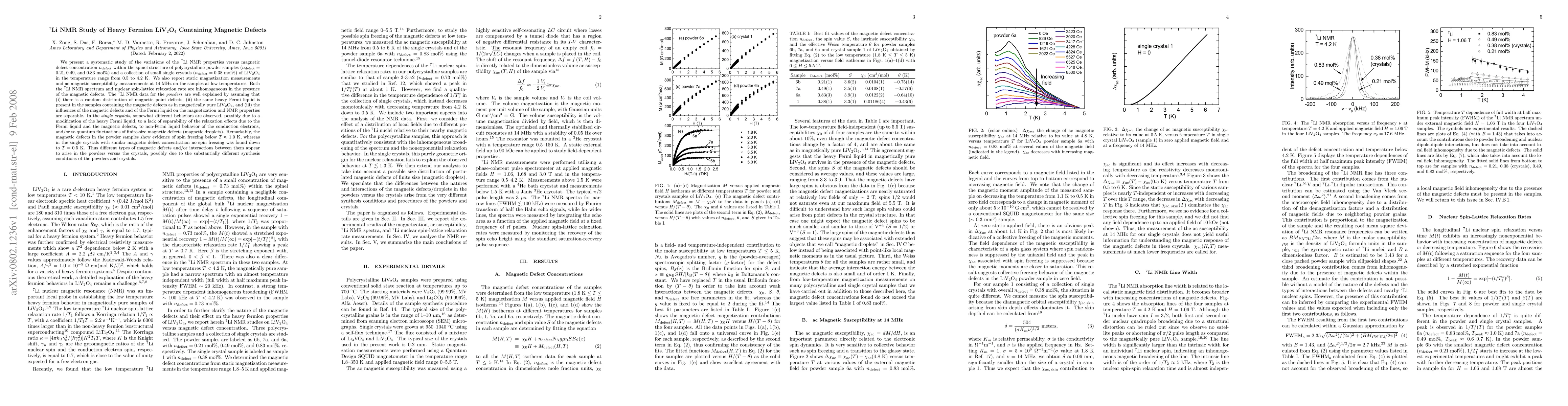 We present a systematic study of the variations of the ^{7}Li NMR properties versus magnetic defect concentration up to 0.83 mol% within the spinel structure of polycrystalline powder samples and a collection of small single crystals of LiV2O4 in the temperature range from 0.5 to 4.2 K. We also report static magnetization measurements and ac magnetic susceptibility measurements at 14 MHz on the samples at low temperatures. Both the NMR spectrum and nuclear spin-lattice relaxation rate are inhomogeneous in the presence of the magnetic defects. The NMR data for the powders are well explained by assuming that (i) there is a random distribution of magnetic point defects, (ii) the same heavy Fermi liquid is present in the samples containing the magnetic defects as in magnetically pure LiV2O4, and (iii) the influences of the magnetic defects and of the Fermi liquid on the magnetization and NMR properties are separable. In the single crystals, somewhat different behaviors are observed. Remarkably, the magnetic defects in the powder samples show evidence of spin freezing below T ~ 1.0 K, whereas in the single crystals with similar magnetic defect concentration no spin freezing was found down to 0.5 K. Thus different types of magnetic defects and/or interactions between them appear to arise in the powders versus the crystals, possibly due to the substantially different synthesis conditions of the powders and crystals.