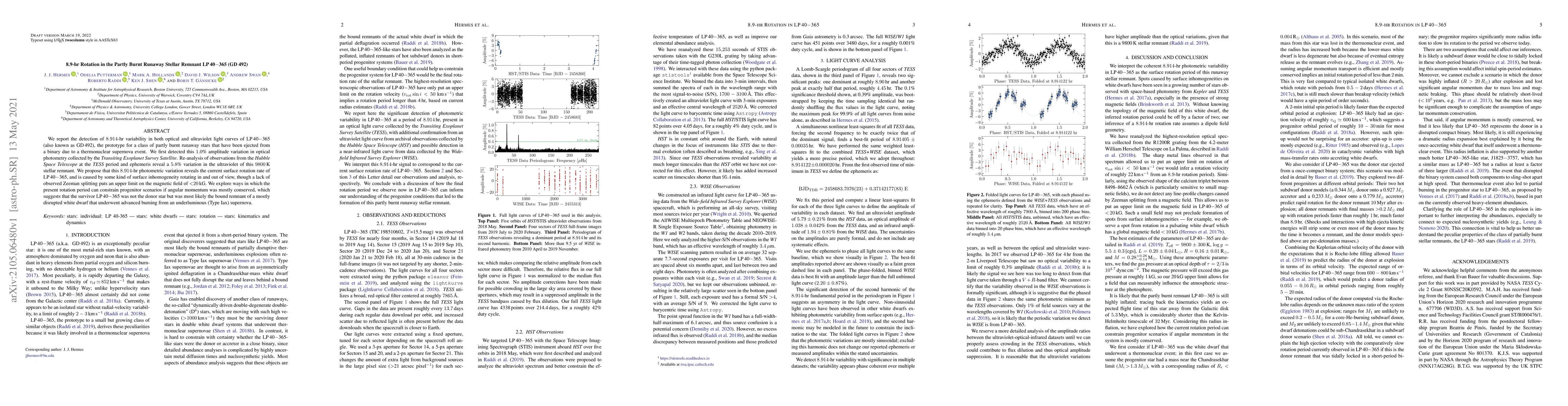 We report the detection of 8.914-hr variability in both optical and ultraviolet light curves of LP 40-365 (also known as GD 492), the prototype for a class of partly burnt runaway stars that have been ejected from a binary due to a thermonuclear supernova event. We first detected this 1.0% amplitude variation in optical photometry collected by the Transiting Exoplanet Survey Satellite. Re-analysis of observations from the Hubble Space Telescope at the TESS period and ephemeris reveal a 5.8% variation in the ultraviolet of this 9800 K stellar remnant. We propose that this 8.914-hr photometric variation reveals the current surface rotation rate of LP 40-365, and is caused by some kind of surface inhomogeneity rotating in and out of view, though a lack of observed Zeeman splitting puts an upper limit on the magnetic field of <20 kG. We explore ways in which the present rotation period can constrain progenitor scenarios if angular momentum was mostly conserved, which suggests that the survivor LP 40-365 was not the donor star but was most likely the bound remnant of a mostly disrupted white dwarf that underwent advanced burning from an underluminous (Type Iax) supernova.