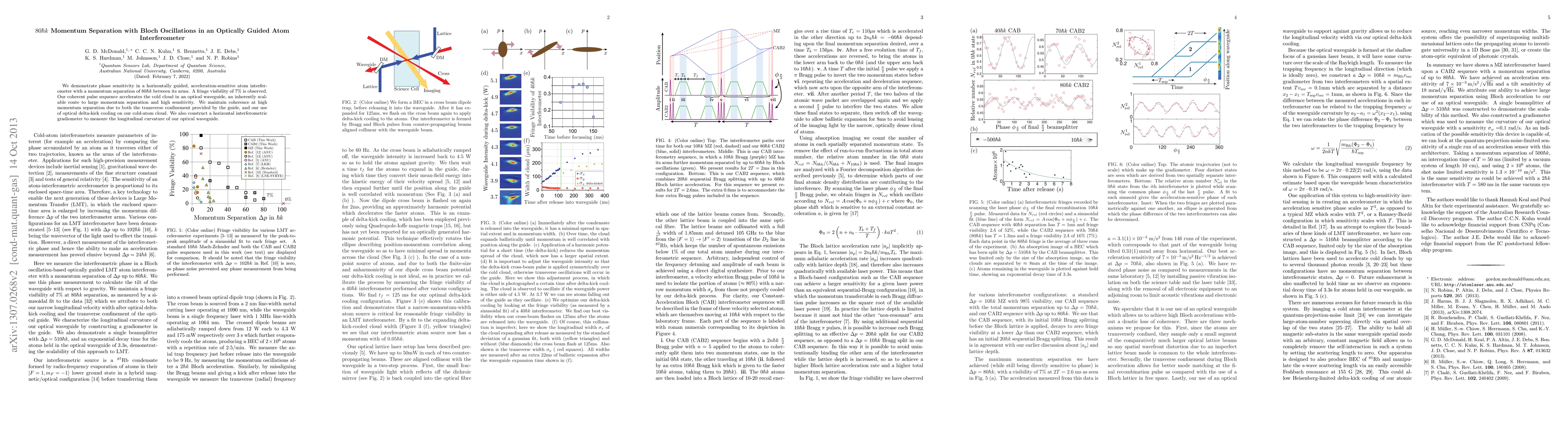This paper demonstrates a phase-sensitive atom interferometer with a 80hk momentum separation using Bloch oscillations in an optical waveguide, achieving 7% fringe visibility. The method employs coherent pulse sequences and optical delta-kick cooling to maintain coherence at high separations and constructs a gradiometer to measure waveguide curvature.