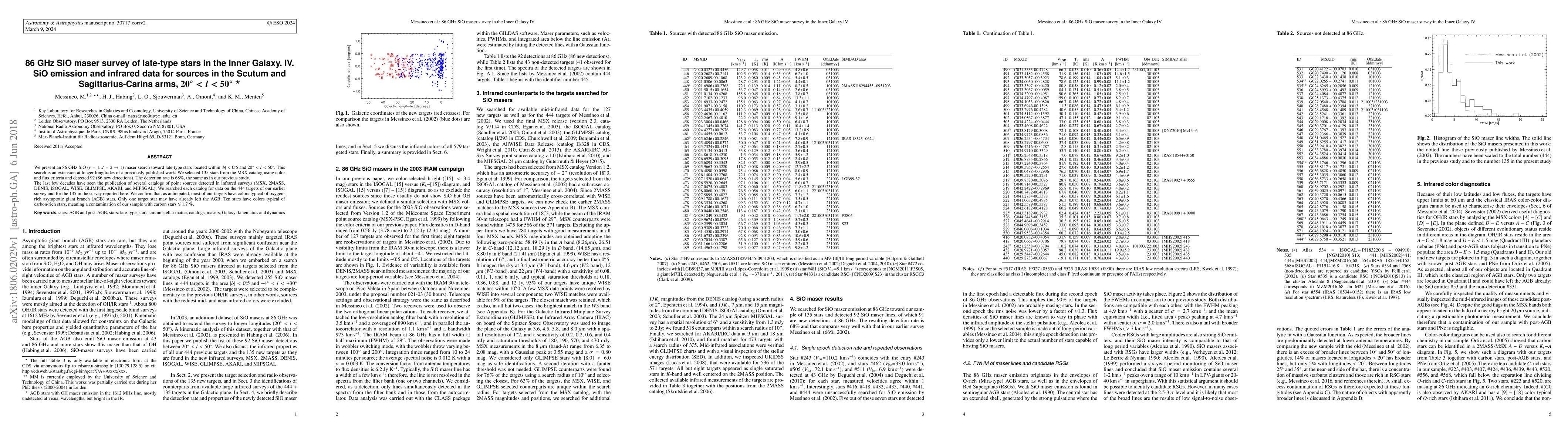 This paper reports an 86 GHz SiO maser survey of late-type stars in the Scutum and Sagittarius-Carina arms of the Milky Way, detecting 92 out of 135 stars, with a 68% detection rate. Most targets are oxygen-rich AGB stars, with a minor contamination of carbon-rich stars.
