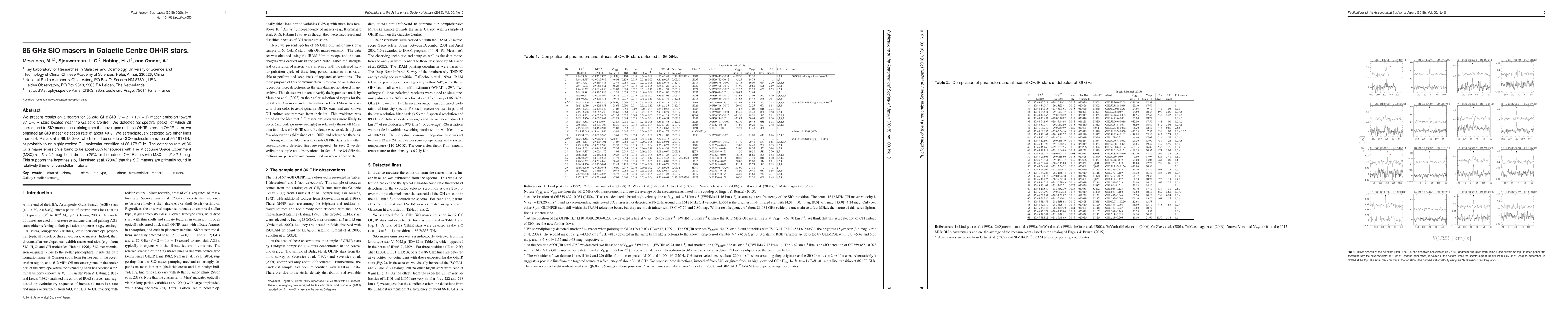 We present results on a search for 86.243 GHz SiO (J = 2 -- 1, v = 1) maser emission toward 67 OH/IR stars located near the Galactic Centre. We detected 32 spectral peaks, of which 28 correspond to SiO maser lines arising from the envelopes of these OH/IR stars. In OH/IR stars, we obtained an SiO maser detection rate of about 40%. We serendipitously detected two other lines from OH/IR stars at 86.18 GHz, which could be due to a CCS-molecule transition at 86.181 GHz or probably to an highly excited OH molecular transition at 86.178 GHz. The detection rate of 86 GHz maser emission is found to be about 60% for sources with The Midcourse Space Experiment (MSX) A - E < 2.5 mag; but it drops to 25% for the reddest OH/IR stars with MSX A - E > 2.5 mag. This supports the hypothesis by Messineo et al. (2002) that the SiO masers are primarily found in relatively thinner circumstellar material.