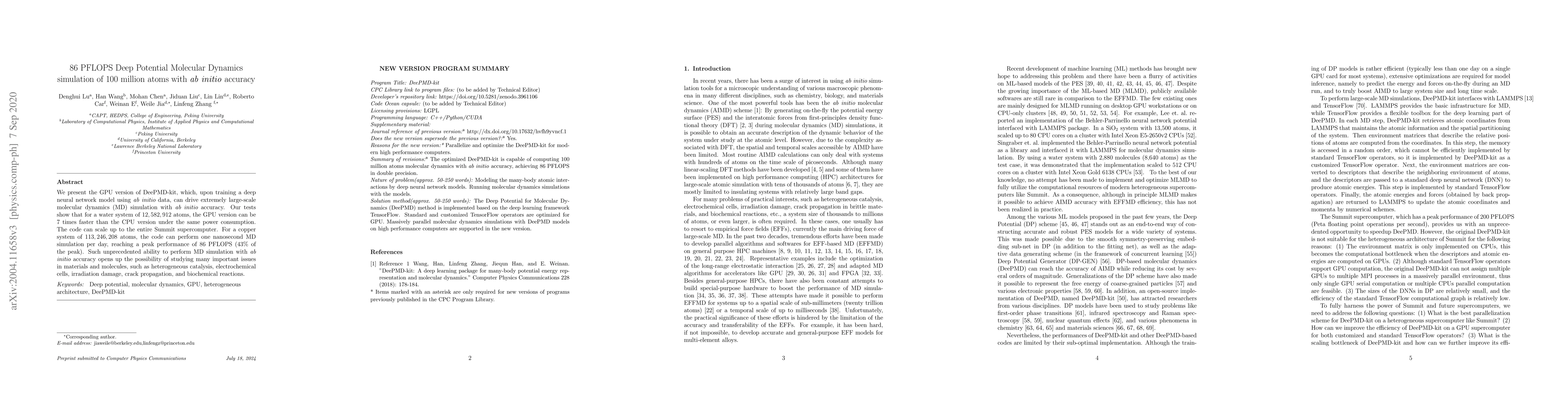 This paper introduces a GPU-optimized version of DeePMD-kit, enabling 86 PFLOPS deep potential molecular dynamics simulations of 100 million atoms with ab initio accuracy. The GPU version is 7 times faster than the CPU version, scaling to the Summit supercomputer and facilitating studies on complex materials phenomena.