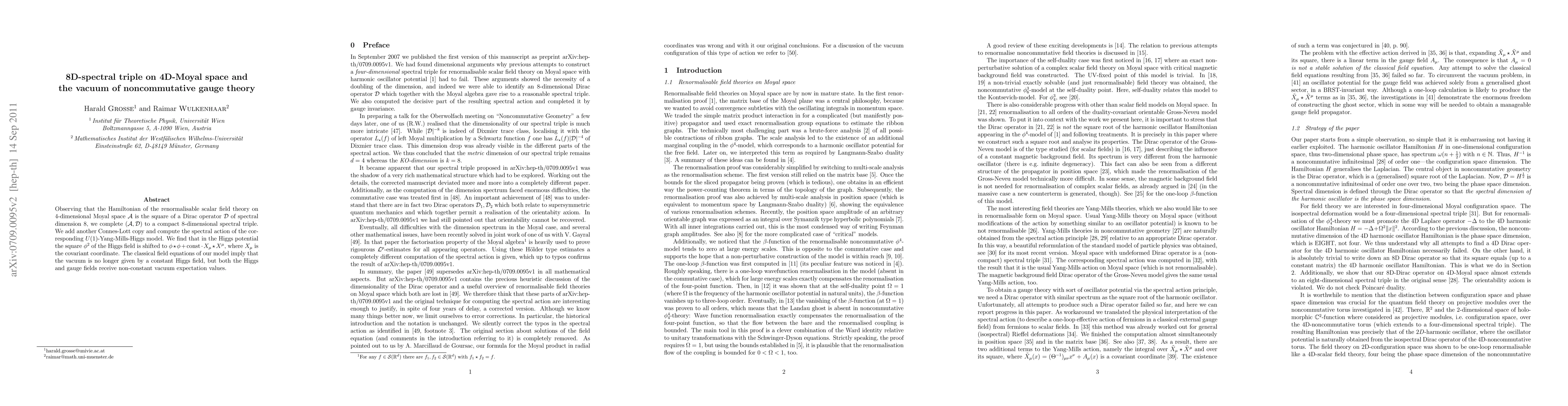 Observing that the Hamiltonian of the renormalisable scalar field theory on 4-dimensional Moyal space A is the square of a Dirac operator D of spectral dimension 8, we complete (A,D) to a compact 8-dimensional spectral triple. We add another Connes-Lott copy and compute the spectral action of the corresponding U(1)-Yang-Mills-Higgs model. We find that in the Higgs potential the square \phi^2 of the Higgs field is shifted to \phi * \phi + const X_\mu * X^\mu, where X_\mu is the covariant coordinate. The classical field equations of our model imply that the vacuum is no longer given by a constant Higgs field, but both the Higgs and gauge fields receive non-constant vacuum expectation values.