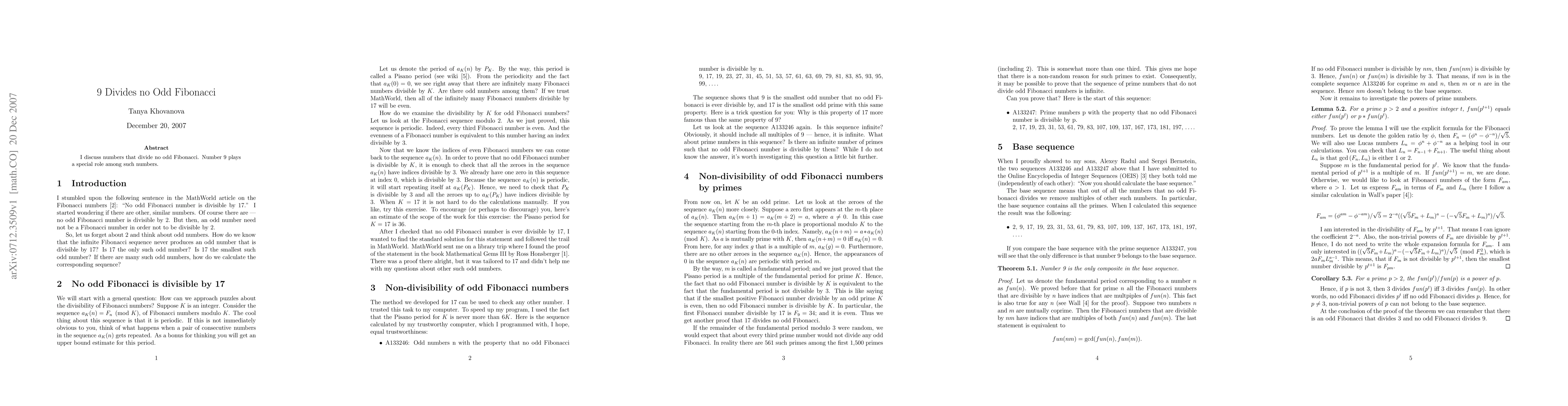 I discuss numbers that divide no odd Fibonacci. Number 9 plays a special role among such numbers.
