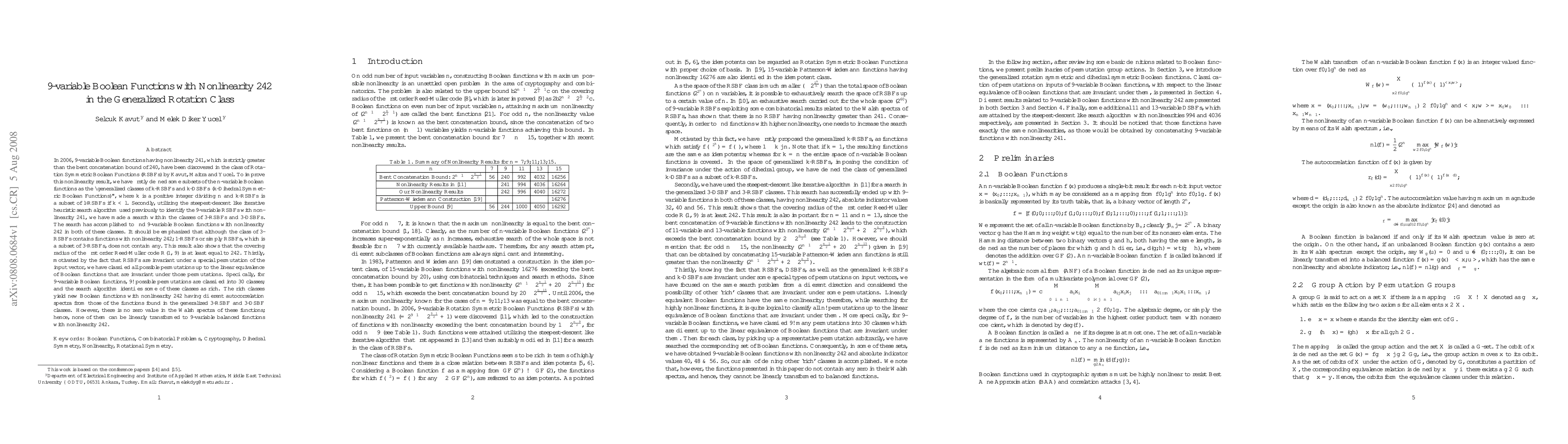 This paper discovers 9-variable Boolean functions with nonlinearity 242 in generalized rotation classes, improving upon previous results. It identifies new functions within 3-RSBF and 3-DSBF classes, showing that the covering radius of R(1, 9) is at least 242, and classifies permutations of functions invariant under specific rotations.