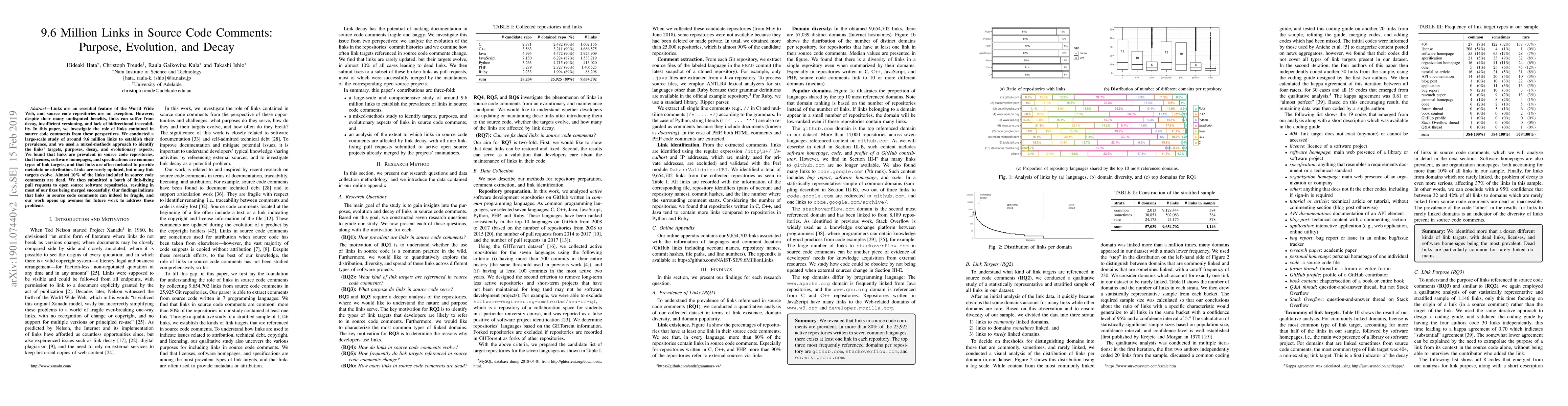 This paper investigates 9.6 million links in source code comments, revealing their prevalence, common targets like licenses and specifications, and the frequent decay and lack of updates. The study suggests that links are often used for metadata or attribution, with nearly 10% being dead, and proposes a successful initiative to fix these links in open source repositories.