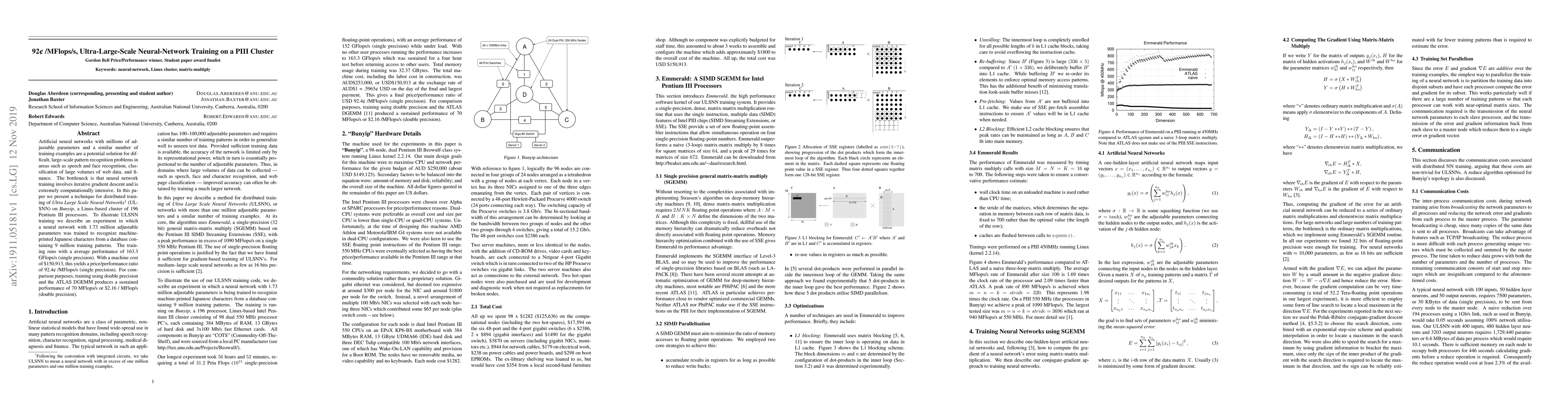 This paper details a distributed training technique for Ultra Large Scale Neural Networks (ULSNN) on a Linux-based cluster of 196 Pentium III processors, achieving 163.3 GFlops/s in single precision. The cost-effective training of a neural network with 1.73 million parameters on a \$150,913 cluster yields a price/performance ratio of 92.4c/MFlops/s.
