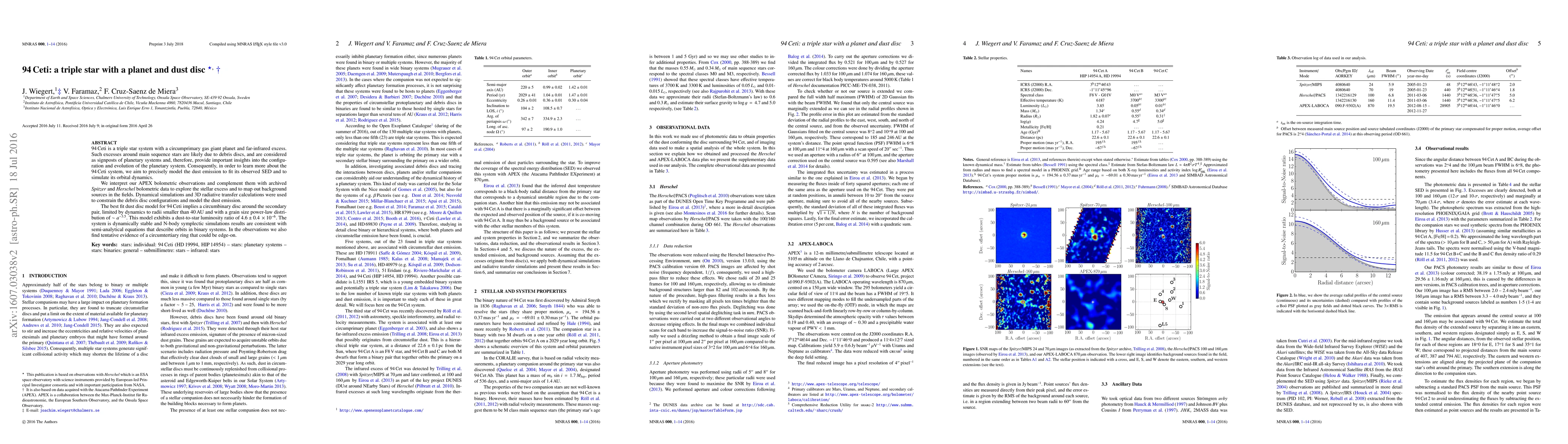 94 Ceti is a triple star system with a circumprimary gas giant planet and far-infrared excess. Such excesses around main sequence stars are likely due to debris discs, and are considered as signposts of planetary systems and, therefore, provide important insights into the configuration and evolution of the planetary system. Consequently, in order to learn more about the 94 Ceti system, we aim to precisely model the dust emission to fit its observed SED and to simulate its orbital dynamics. We interpret our APEX bolometric observations and complement them with archived Spitzer and Herschel bolometric data to explore the stellar excess and to map out background sources in the fields. Dynamical simulations and 3D radiative transfer calculations were used to constrain the debris disc configurations and model the dust emission. The best fit dust disc model for 94 Ceti implies a circumbinary disc around the secondary pair, limited by dynamics to radii smaller than 40 AU and with a grain size power-law distribution of ~a^-3.5. This model exhibits a dust-to-star luminosity ratio of 4.6+-0.4*10^-6. The system is dynamically stable and N-body symplectic simulations results are consistent with semi-analytical equations that describe orbits in binary systems. In the observations we also find tentative evidence of a circumtertiary ring that could be edge-on.
