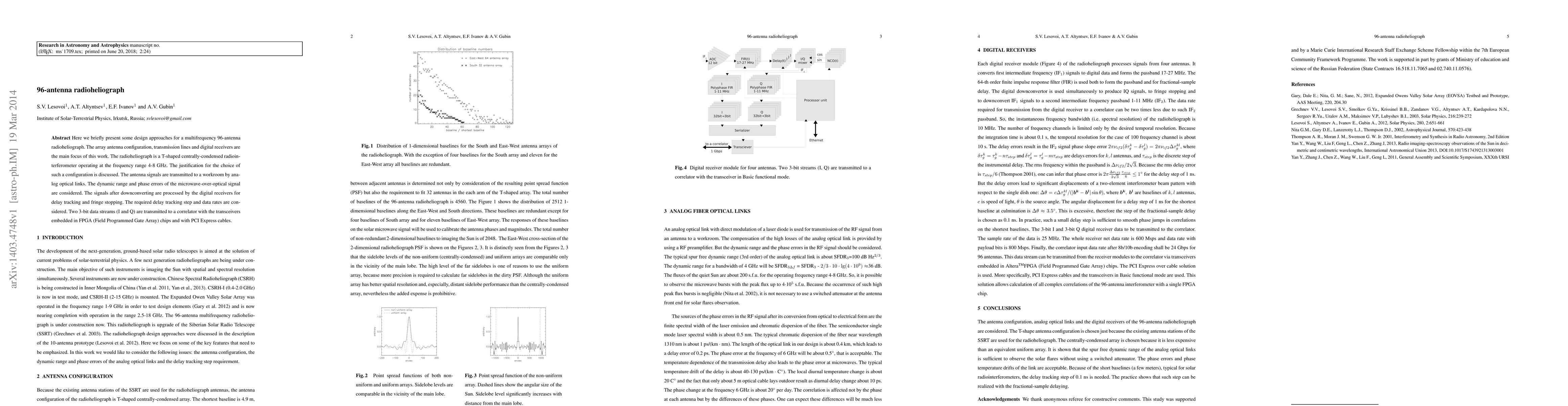 A 96-antenna radioheliograph design is presented, focusing on array antenna configuration, transmission lines, and digital receivers, with implications for radio astronomy research and development.