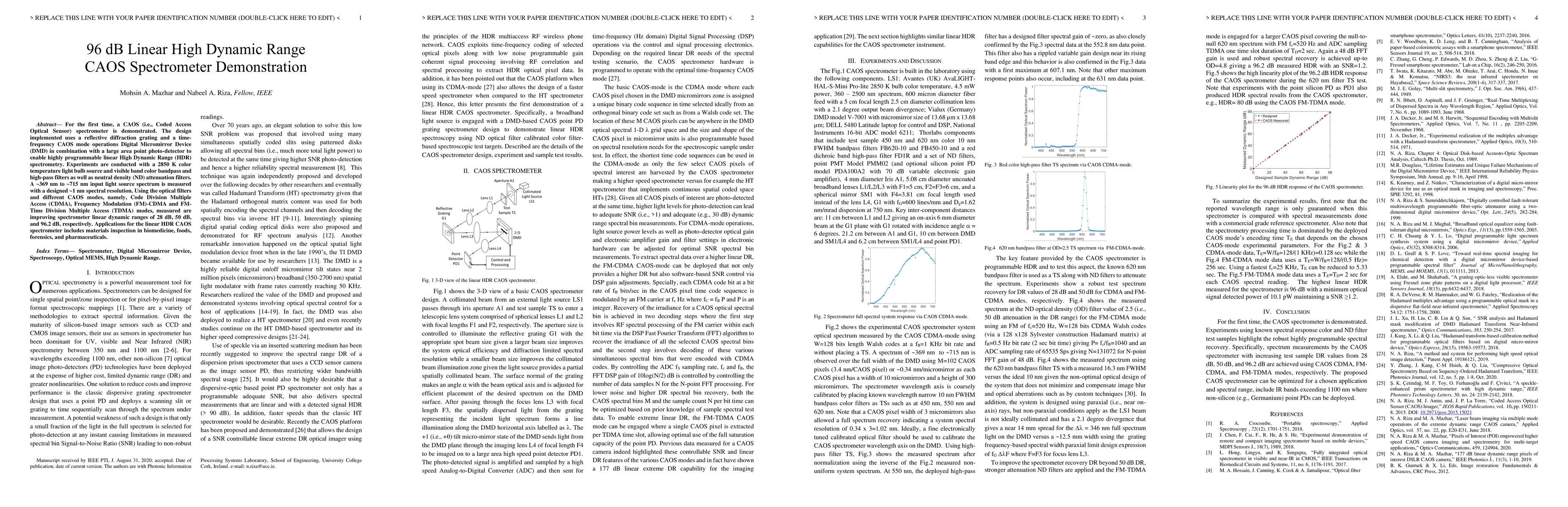 For the first time, a CAOS (i.e., Coded Access Optical Sensor) spectrometer is demonstrated. The design implemented uses a reflective diffraction grating and a time-frequency CAOS mode operations Digital Micromirror Device (DMD) in combination with a large area point photo-detector to enable highly programmable linear High Dynamic Range (HDR) spectrometry. Experiments are conducted with a 2850 K color temperature light bulb source and visible band color bandpass and high-pass filters as well as neutral density (ND) attenuation filters. A ~369 nm to ~715 nm input light source spectrum is measured with a designed ~1 nm spectral resolution. Using the optical filters and different CAOS modes, namely, Code Division Multiple Access (CDMA), Frequency Modulation (FM)-CDMA and FM-Time Division Multiple Access (TDMA) modes, measured are improving spectrometer linear dynamic ranges of 28 dB, 50 dB, and 96.2 dB, respectively. Applications for the linear HDR CAOS spectrometer includes materials inspection in biomedicine, foods, forensics, and pharmaceuticals.