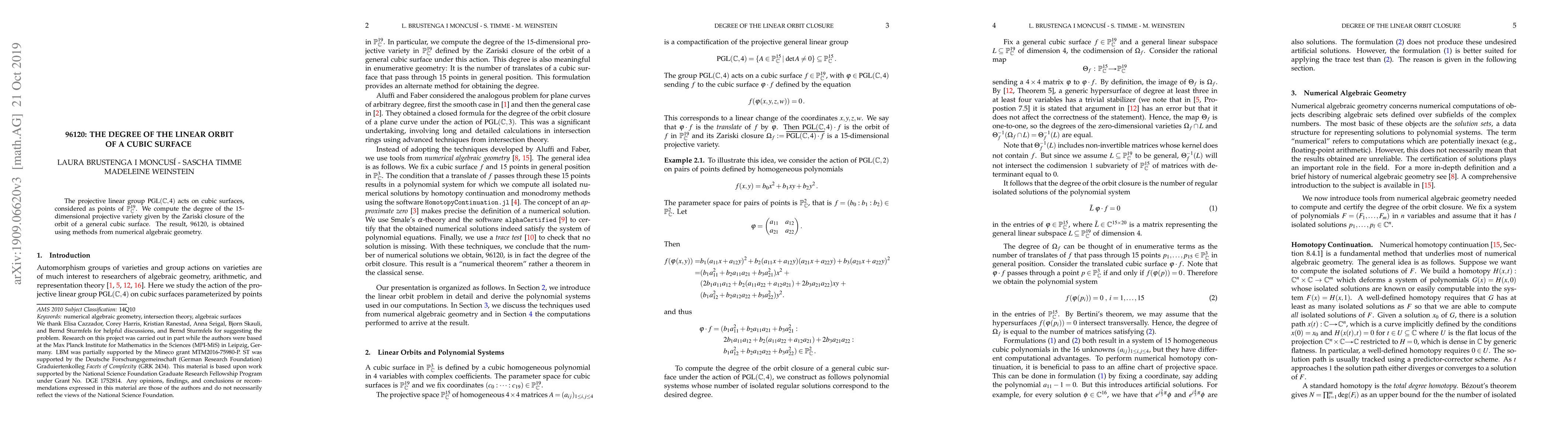 The projective linear group \(\pgl(\comp,4)\) acts on cubic surfaces, considered as points of $\mathbb{P}_{\mathbb{C}}^{19}$. We compute the degree of the $15$-dimensional projective variety given by the Zariski closure of the orbit of a general cubic surface. The result, 96120, is obtained using methods from numerical algebraic geometry.