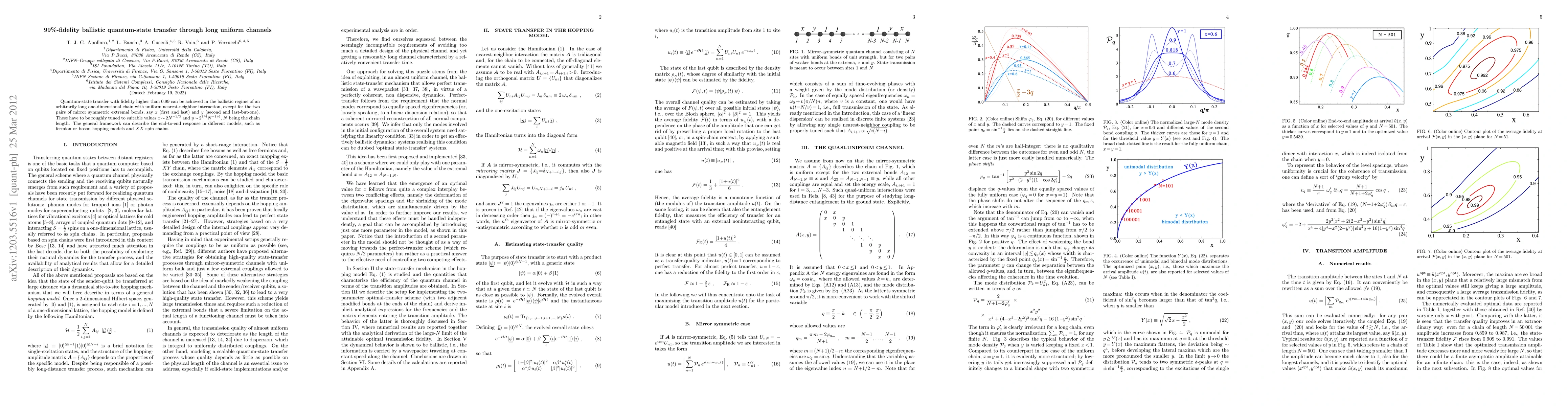 This paper demonstrates a method for achieving 99%-fidelity ballistic quantum-state transfer through long uniform channels, with minor adjustments required for the first and last bonds. The technique applies to various quantum models, including fermion or boson hopping and XX spin chains.