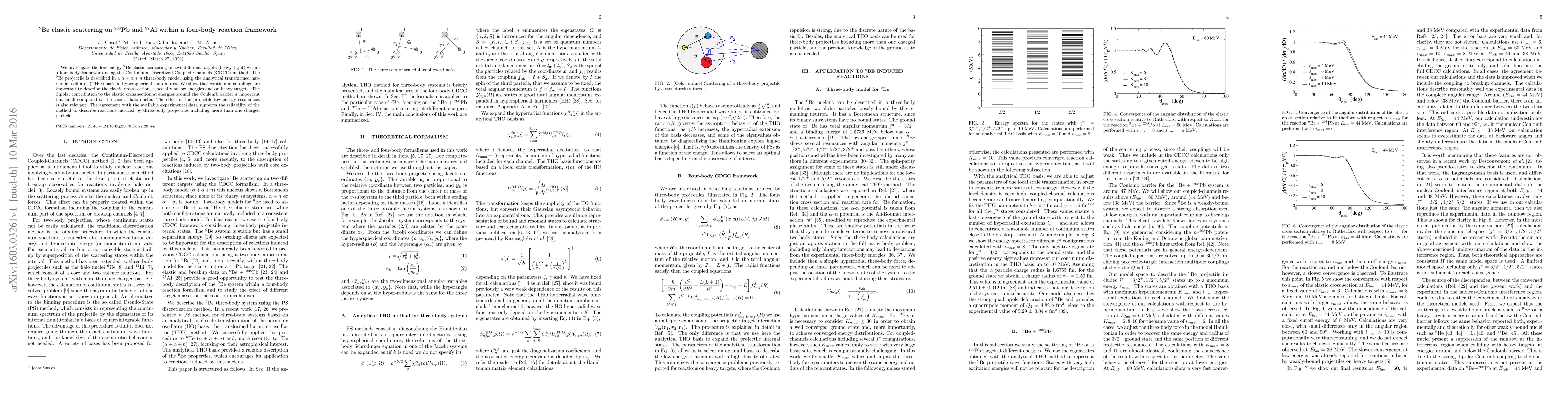 We investigate the low-energy $^9$Be elastic scattering on two different targets (heavy, light) within a four-body framework using the Continuum-Discretized Coupled-Channels (CDCC) method. The $^9$Be projectile is described in a $\alpha + \alpha + n$ three-body model using the analytical transformed harmonic oscillator (THO) basis in hyperspherical coordinates. We show that continuum couplings are important to describe the elastic cross section, especially at low energies and on heavy targets. The dipolar contribution to the elastic cross section at energies around the Coulomb barrier is important but small compared to the case of halo nuclei. The effect of the projectile low-energy resonances is also relevant. The agreement with the available experimental data supports the reliability of the method to describe reactions induced by three-body projectiles including more than one charged particle.