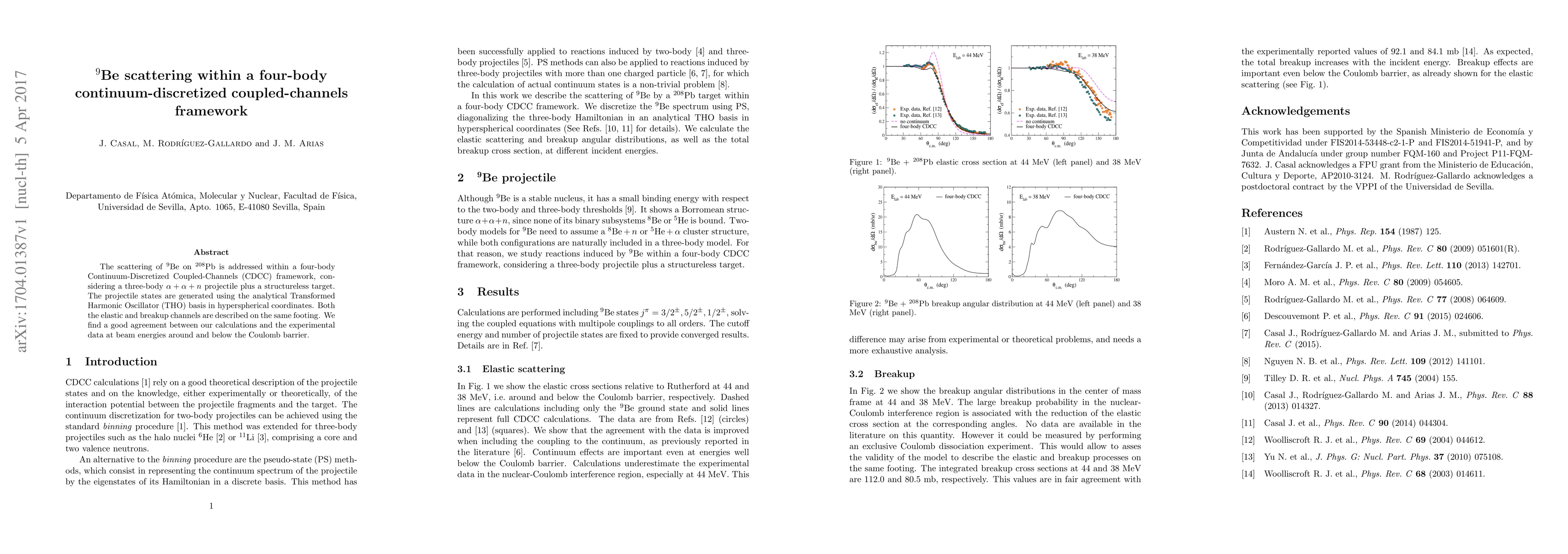 This paper investigates the scattering of $^9$Be on $^{208}$Pb using a four-body Continuum-Discretized Coupled-Channels (CDCC) framework, modeling the $^9$Be as a three-body $\alpha + \alpha + n$ system. The study shows good agreement between theoretical calculations and experimental data for beam energies near and below the Coulomb barrier.