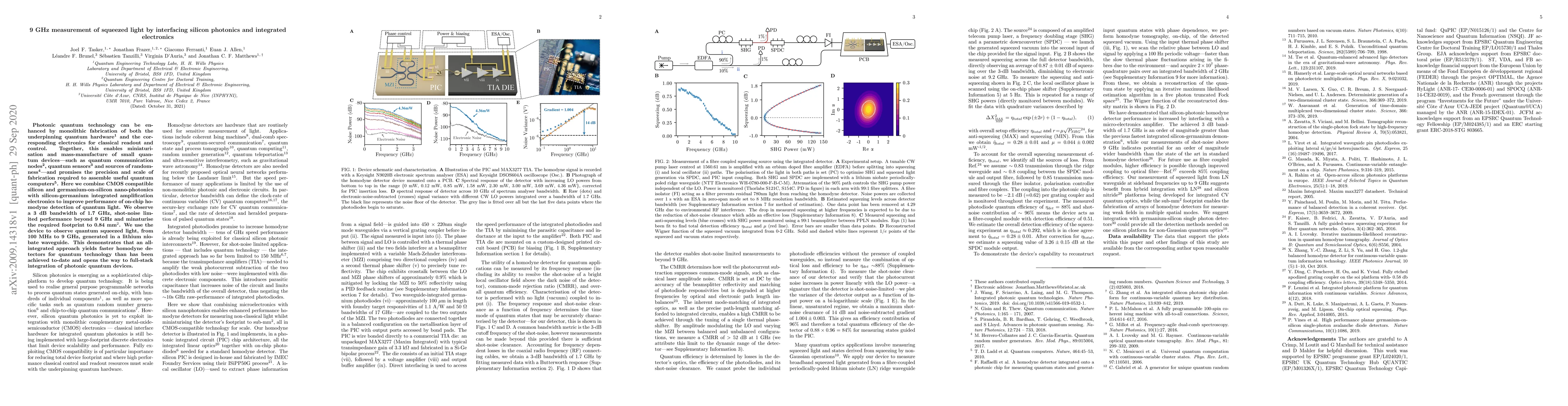 This research combines silicon photonics with integrated electronics to enhance on-chip homodyne detection of squeezed light up to 9 GHz, achieving a 3 dB bandwidth of 1.7 GHz and a footprint of 0.84 mm, promising advancements in quantum technology and communication.