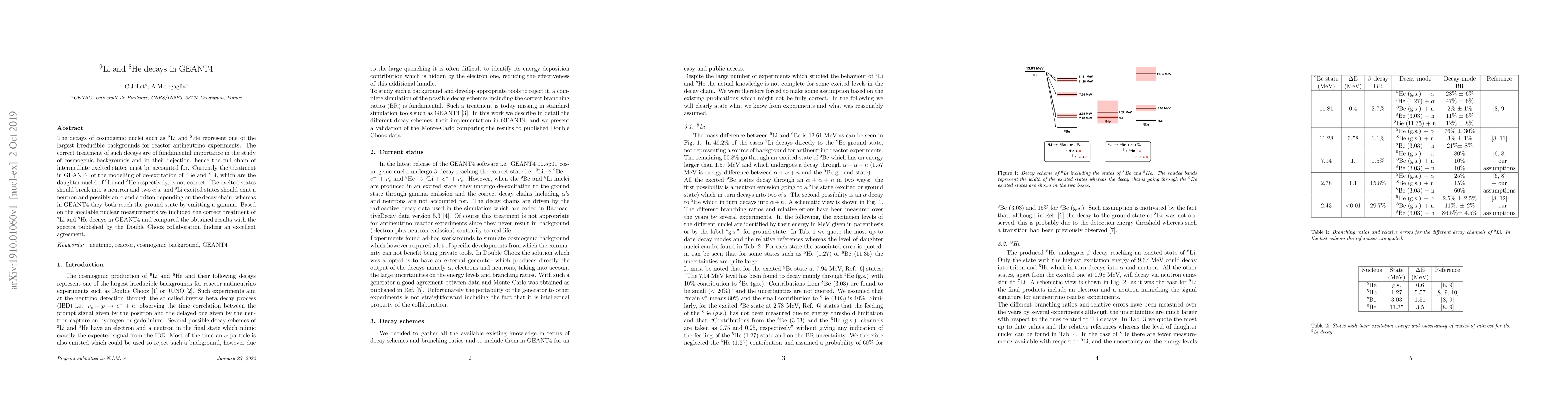 The decays of cosmogenic nuclei such as $^9$Li and $^8$He represent one of the largest irreducible backgrounds for reactor antineutrino experiments. The correct treatment of such decays are of fundamental importance in the study of cosmogenic backgrounds and in their rejection, hence the full chain of intermediate excited states must be accounted for. Currently the treatment in GEANT4 of the modelling of de-excitation of $^9$Be and $^8$Li, which are the daughter nuclei of $^9$Li and $^8$He respectively, is not correct. $^9$Be excited states should break into a neutron and two $\alpha$'s, and $^8$Li excited states should emit a neutron and possibly an $\alpha$ and a triton depending on the decay chain, whereas in GEANT4 they both reach the ground state by emitting a gamma. Based on the available nuclear measurements we included the correct treatment of $^9$Li and $^8$He decays in GEANT4 and compared the obtained results with the spectra published by the Double Chooz collaboration finding an excellent agreement.