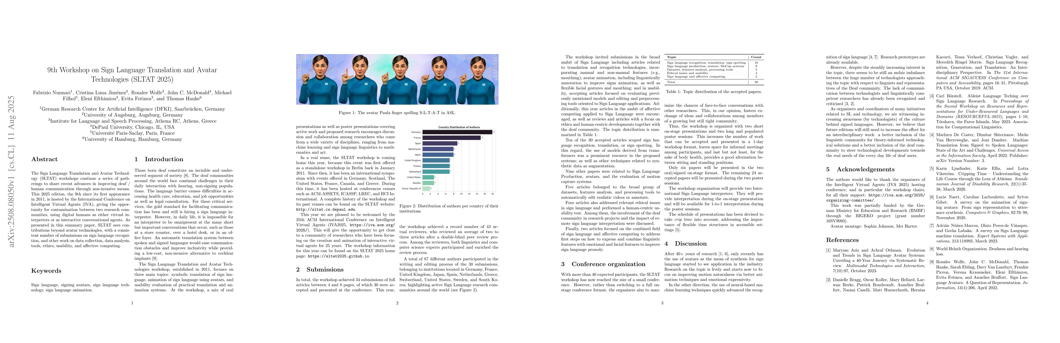 The Sign Language Translation and Avatar Technology (SLTAT) workshops continue a series of gatherings to share recent advances in improving deaf / human communication through non-invasive means. This 2025 edition, the 9th since its first appearance in 2011, is hosted by the International Conference on Intelligent Virtual Agents (IVA), giving the opportunity for contamination between two research communities, using digital humans as either virtual interpreters or as interactive conversational agents. As presented in this summary paper, SLTAT sees contributions beyond avatar technologies, with a consistent number of submissions on sign language recognition, and other work on data collection, data analysis, tools, ethics, usability, and affective computing.