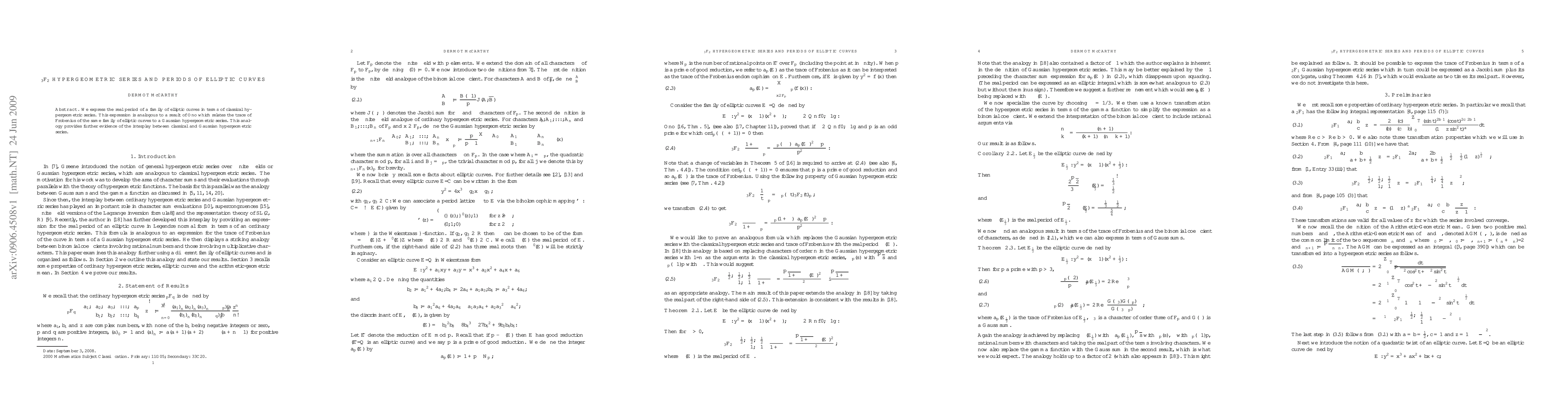 Summary: The paper expresses the real period of a family of elliptic curves using classical hypergeometric series, mirroring Ono's result linking the trace of Frobenius to a Gaussian hypergeometric series, thereby highlighting connections between classical and Gaussian hypergeometric series.