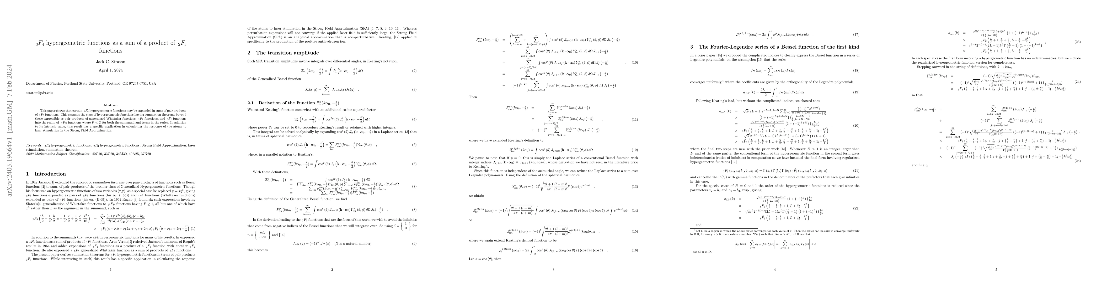 This paper demonstrates that certain $\,_{3}F_{4}$ hypergeometric functions can be expressed as sums of products of $\,_{2}F_{3}$ functions, extending summation theorems and has practical implications for calculating atomic responses to laser stimulation.