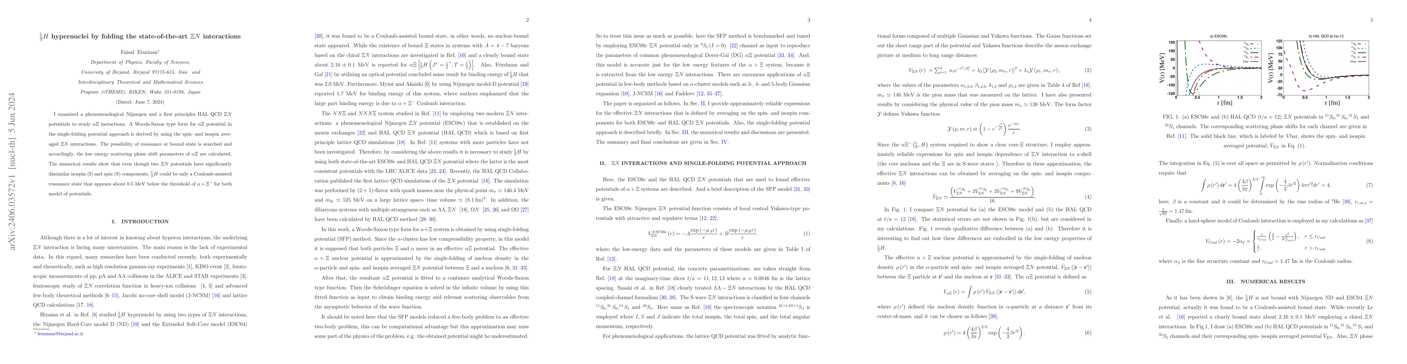 I examined a phenomenological Nijmegen and a first principles HAL QCD $\Xi N$ potentials to study $\alpha\Xi$ ineractions. A Woods-Saxon type form for $\alpha\Xi$ potential in the single-folding potential approach is derived by using the spin- and isospin averaged $\Xi N$ interactions. The possibility of resonance or bound state is searched and accordingly, the low energy scattering phase shift parameters of $\alpha\Xi$ are calculated. The numerical results show that even though two $ \Xi N $ potentials have significantly dissimilar isospin (I) and spin (S) components, $_{\Xi}^{5}H $ could be only a Coulomb-assisted resonance state that appears about $ 0.5 $ MeV below the threshold of $\alpha+\Xi^{-} $ for both model of potentials.