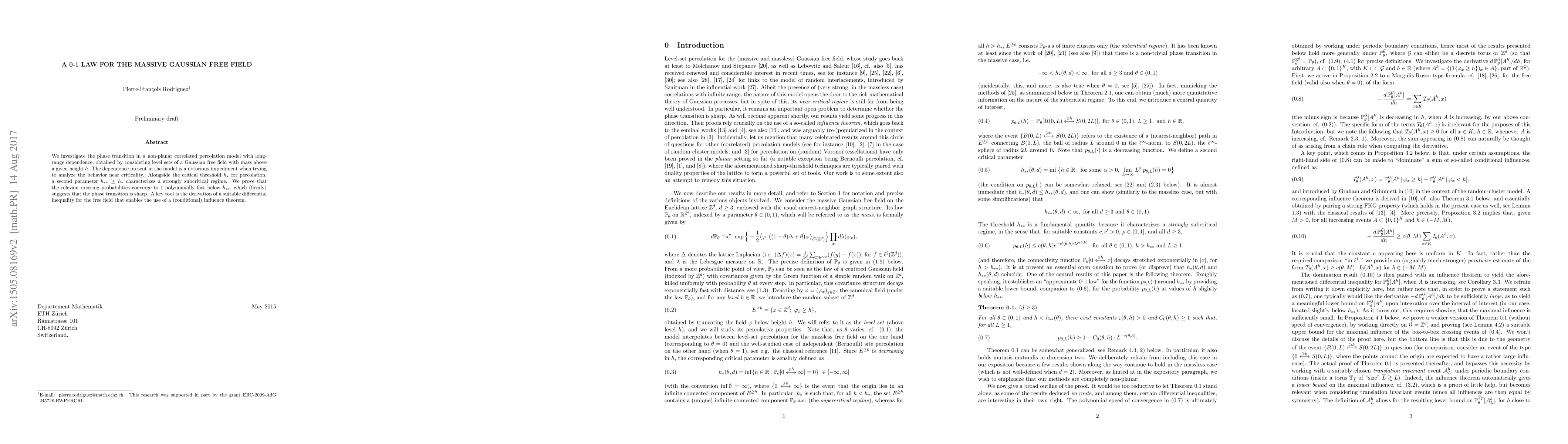 We investigate the phase transition in a non-planar correlated percolation model with long-range dependence, obtained by considering level sets of a Gaussian free field with mass above a given height $h$. The dependence present in the model is a notorious impediment when trying to analyze the behavior near criticality. Alongside the critical threshold $h_{*}$ for percolation, a second parameter $h_{**} \geq h_{*}$ characterizes a strongly subcritical regime. We prove that the relevant crossing probabilities converge to $1$ polynomially fast below $h_{**}$, which (firmly) suggests that the phase transition is sharp. A key tool is the derivation of a suitable differential inequality for the free field that enables the use of a (conditional) influence theorem.