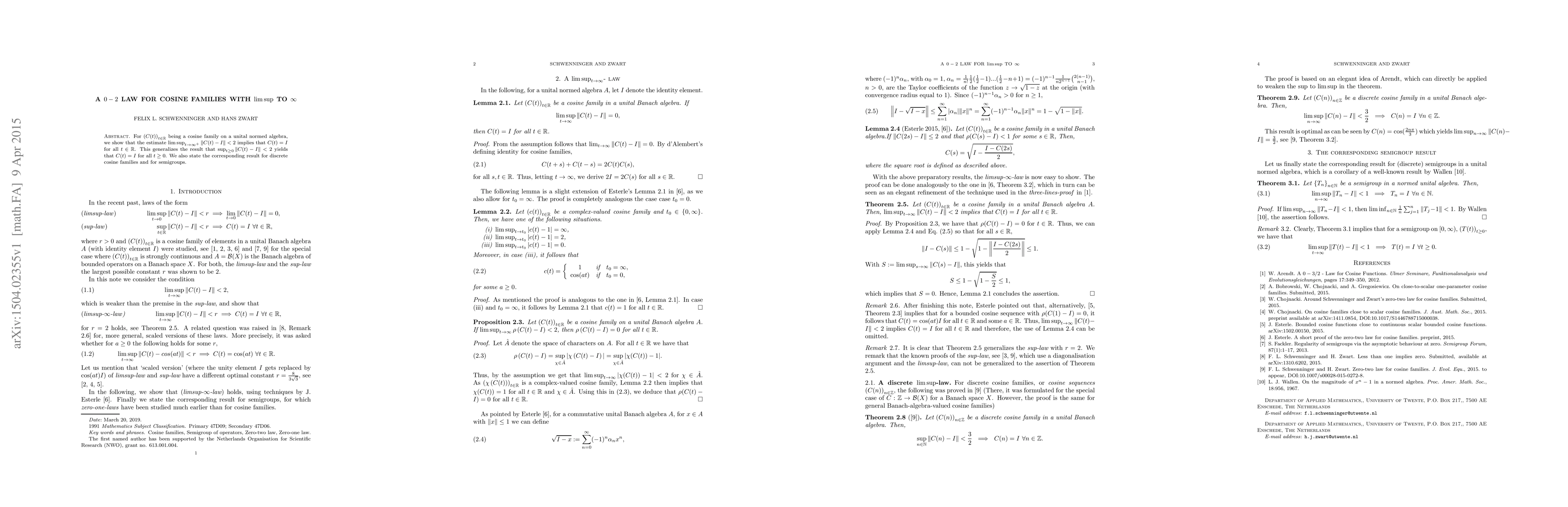 This paper proves a $0-2$ law for cosine families, showing that if $\limsup_{t\to\infty^{+}}\|C(t) - I\|<2$, then $C(t)=I$ for all $t\in\mathbb{R}$. It generalizes the result for continuous cosine families and extends the findings to discrete cosine families and semigroups.