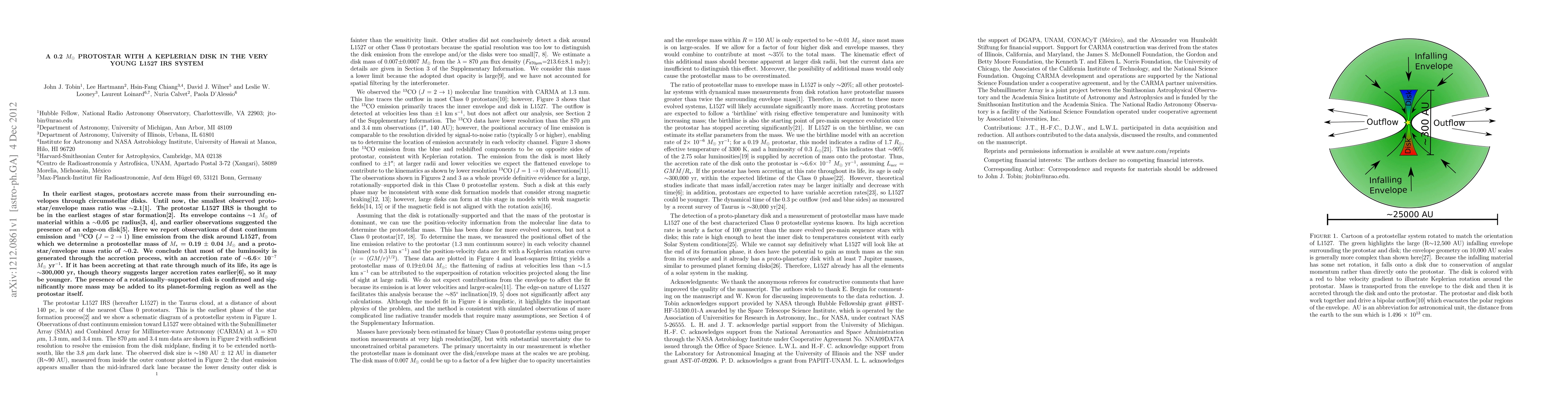 This paper reports the discovery of a 0.2 solar mass protostar, L1527 IRS, with a Keplerian disk, indicating an unprecedented low protostar/envelope mass ratio of ~0.2. The study confirms the presence of a rotationally-supported disk and suggests that the protostar's luminosity is primarily generated through accretion at a rate of ~6.6 x 10^-7 solar masses per year.
