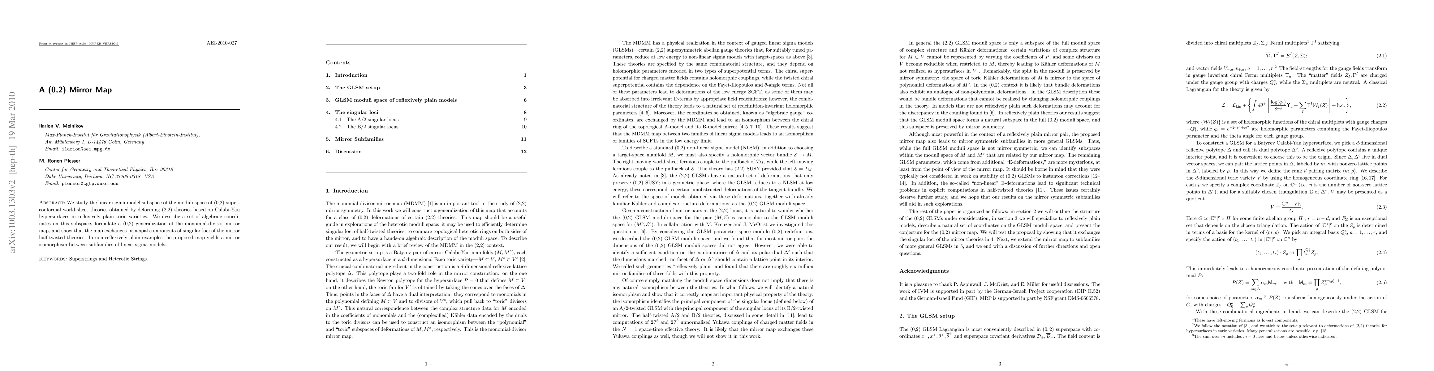 We study the linear sigma model subspace of the moduli space of (0,2) superconformal world-sheet theories obtained by deforming (2,2) theories based on Calabi-Yau hypersurfaces in reflexively plain toric varieties. We describe a set of algebraic coordinates on this subspace, formulate a (0,2) generalization of the monomial-divisor mirror map, and show that the map exchanges principal components of singular loci of the mirror half-twisted theories. In non-reflexively plain examples the proposed map yields a mirror isomorphism between subfamilies of linear sigma models.