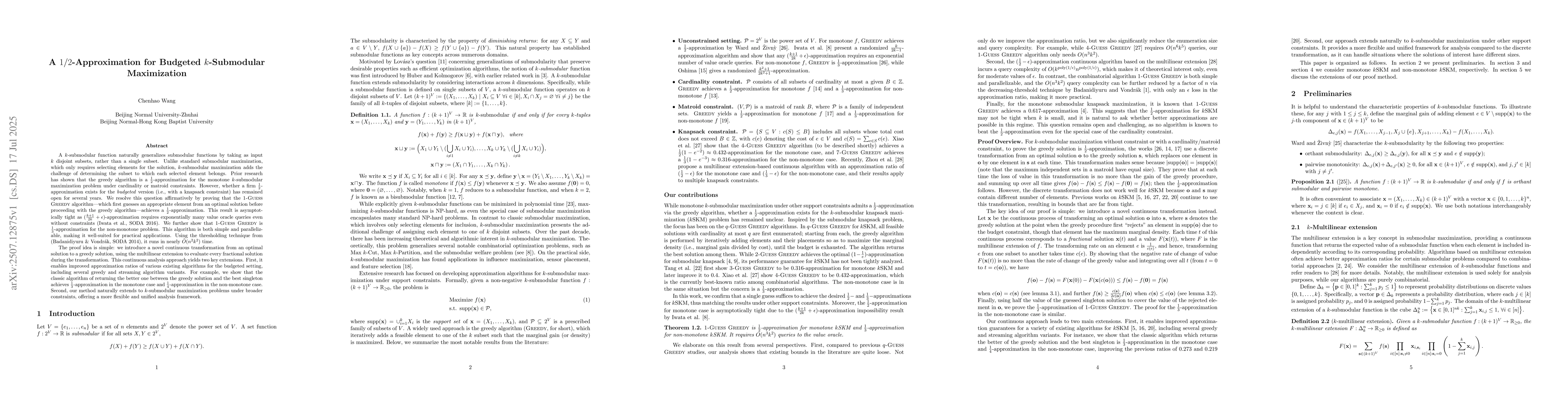 A $k$-submodular function naturally generalizes submodular functions by taking as input $k$ disjoint subsets, rather than a single subset. Unlike standard submodular maximization, which only requires selecting elements for the solution, $k$-submodular maximization adds the challenge of determining the subset to which each selected element belongs. Prior research has shown that the greedy algorithm is a 1/2-approximation for the monotone $k$-submodular maximization problem under cardinality or matroid constraints. However, whether a firm 1/2-approximation exists for the budgeted version (i.e., with a knapsack constraint) has remained open for several years. We resolve this question affirmatively by proving that the 1-Guess Greedy algorithm, which first guesses an appropriate element from an optimal solution before proceeding with the greedy algorithm, achieves a 1/2-approximation. This result is asymptotically tight as $((k+1)/(2k)+\epsilon)$-approximation requires exponentially many value oracle queries even without constraints (Iwata et al., SODA 2016). We further show that 1-Guess Greedy is 1/3-approximation for the non-monotone problem. This algorithm is both simple and parallelizable, making it well-suited for practical applications. Using the thresholding technique from (Badanidiyuru and Vondrak, SODA 2014), it runs in nearly $\tilde O(n^2k^2)$ time. The proof idea is simple: we introduce a novel continuous transformation from an optimal solution to a greedy solution, using the multilinear extension to evaluate every fractional solution during the transformation. This continuous analysis approach yields two key extensions. First, it enables improved approximation ratios of various existing algorithms. Second, our method naturally extends to $k$-submodular maximization problems under broader constraints, offering a more flexible and unified analysis framework.