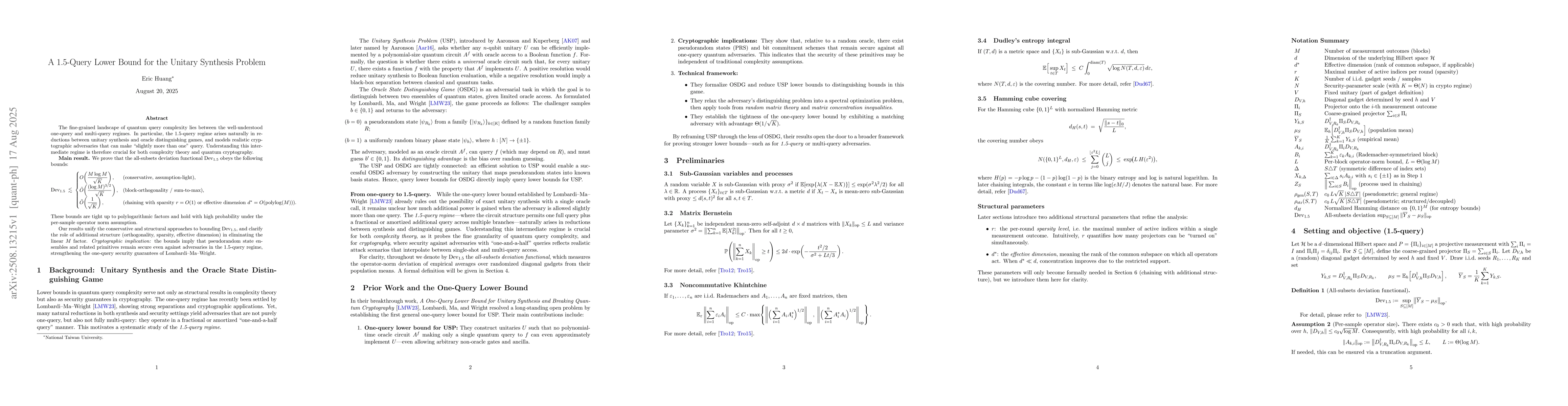 We prove a new lower bound for the unitary synthesis problem in the so-called 1.5-query setting. Our analysis establishes that any attempt to implement arbitrary n-qubit unitaries via limited oracle access requires resources that exceed the fractional query threshold. This result extends the one-query lower bound of Lombardi, Ma, and Wright (2023) to the fractional query regime, and introduces a conservative and chaining-based approach to handle intermediate query complexities. As a consequence, we derive cryptographic implications, showing that pseudorandom quantum states remain secure against adversaries restricted to 1.5 queries. Our work provides both conceptual clarification of fractional-query complexity and practical insights into the design of quantum cryptographic protocols.