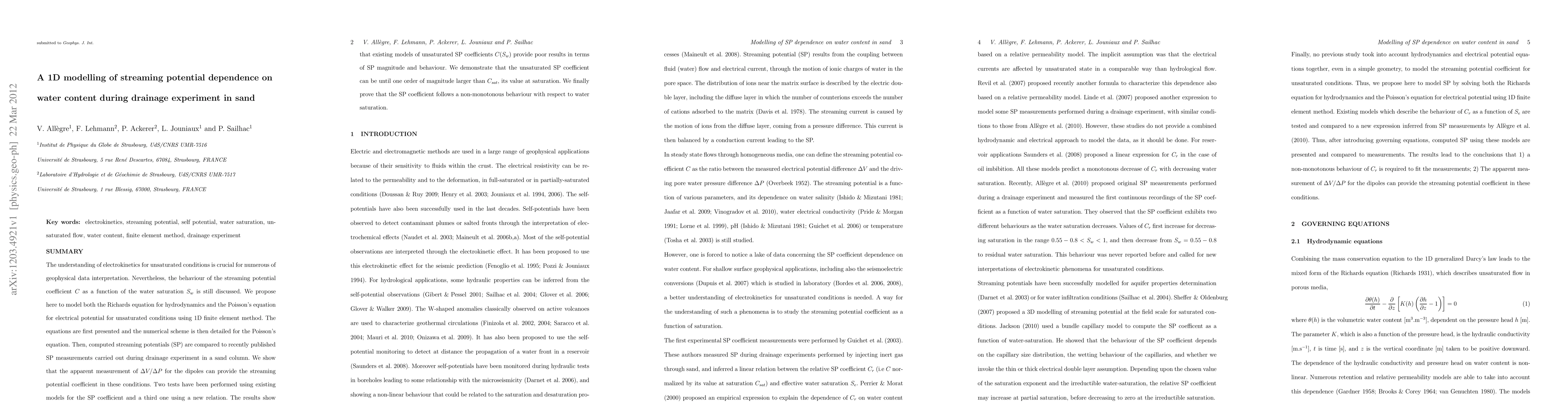 The understanding of electrokinetics for unsaturated conditions is crucial for numerous of geophysical data interpretation. Nevertheless, the behaviour of the streaming potential coefficient C as a function of the water saturation Sw is still discussed. We propose here to model both the Richards' equation for hydrodynamics and the Poisson's equation for electrical potential for unsaturated conditions using 1-D finite element method. The equations are first presented and the numerical scheme is then detailed for the Poisson's equation. Then, computed streaming potentials (SPs) are compared to recently published SP measurements carried out during drainage experiment in a sand column. We show that the apparent measurement of DV / DP for the dipoles can provide the SP coefficient in these conditions. Two tests have been performed using existing models for the SP coefficient and a third one using a new relation. The results show that existing models of unsaturated SP coefficients C(Sw) provide poor results in terms of SP magnitude and behaviour. We demonstrate that the unsaturated SP coefficient can be until one order of magnitude larger than Csat, its value at saturation. We finally prove that the SP coefficient follows a non-monotonous behaviour with respect to water saturation. Key words: Electrical properties; Electromagnetic theory; Hydrogeophysics; Hydrology; Permeability and porosity; electrokinetic; streaming potential; self-potential; water content; water saturation; unsaturated condition; finite element modeling