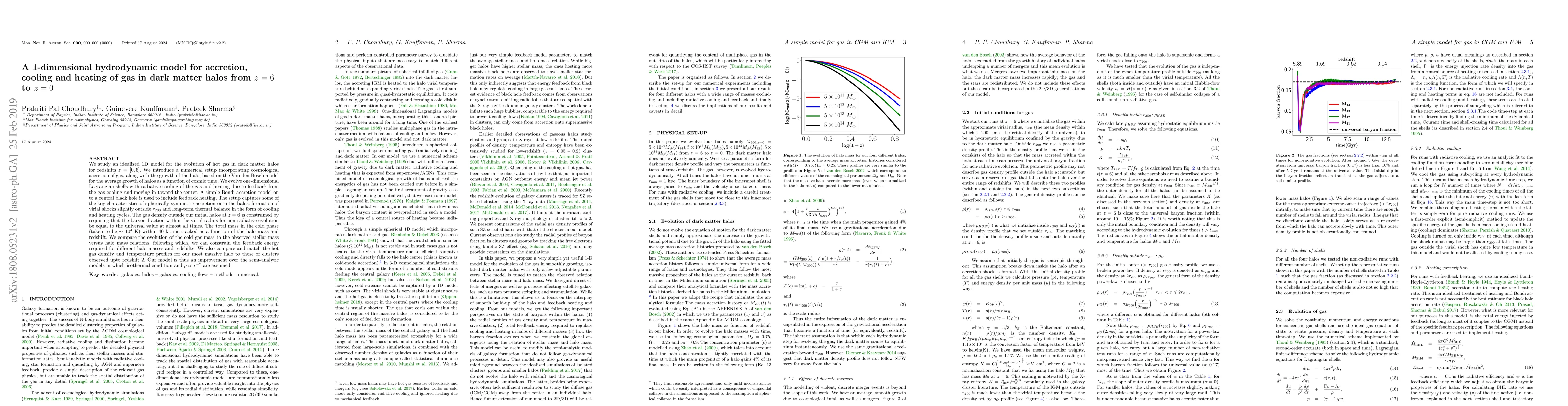 We study an idealized 1D model for the evolution of hot gas in dark matter halos for redshifts $z=[0,6]$. We introduce a numerical setup incorporating cosmological accretion of gas, along with the growth of the halo, based on the Van den Bosch model for the average growth of halos as a function of cosmic time. We evolve one-dimensional Lagrangian shells with radiative cooling of the gas and heating due to feedback from the gas cooling and moving in toward the center. A simple Bondi accretion model on to a central black hole is used to include feedback heating. The setup captures some of the key characteristics of spherically symmetric accretion onto the halos: formation of virial shocks slightly outside $r_{200}$ and long-term thermal balance in the form of cooling and heating cycles. The gas density outside our initial halos at $z=6$ is constrained by requiring that the baryon fraction within the virial radius for non-radiative evolution be equal to the universal value at almost all times. The total mass in the cold phase (taken to be $\sim 10^4$ K) within $40$ kpc is tracked as a function of the halo mass and redshift. We compare the evolution of the cold gas mass to the observed stellar-mass versus halo mass relations, following which, we can constrain the feedback energy required for different halo masses and redshifts. We also compare and match the hot gas density and temperature profiles for our most massive halo to those of clusters observed upto redshift $2$. Our model is thus an improvement over the semi-analytic models in which isothermal condition and $\rho \propto r^{-2}$ are assumed.
