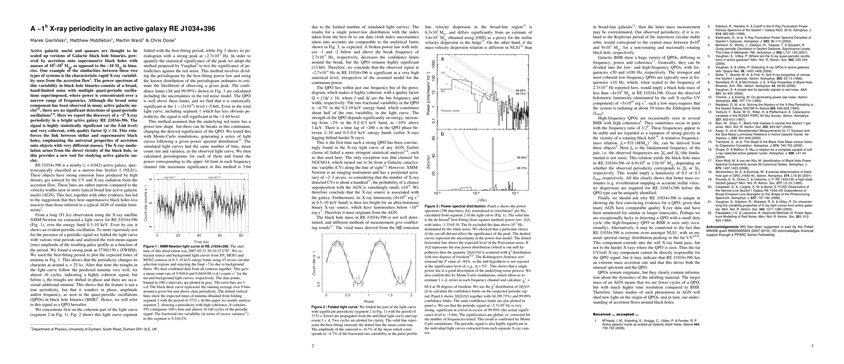 This paper reports the discovery of a ~1-hour X-ray periodicity in the active galaxy RE J1034+396, providing evidence of quasi-periodic oscillations in supermassive black holes similar to those observed in stellar-mass black hole binaries. This discovery reinforces the universal nature of accretion processes across vastly different scales.
