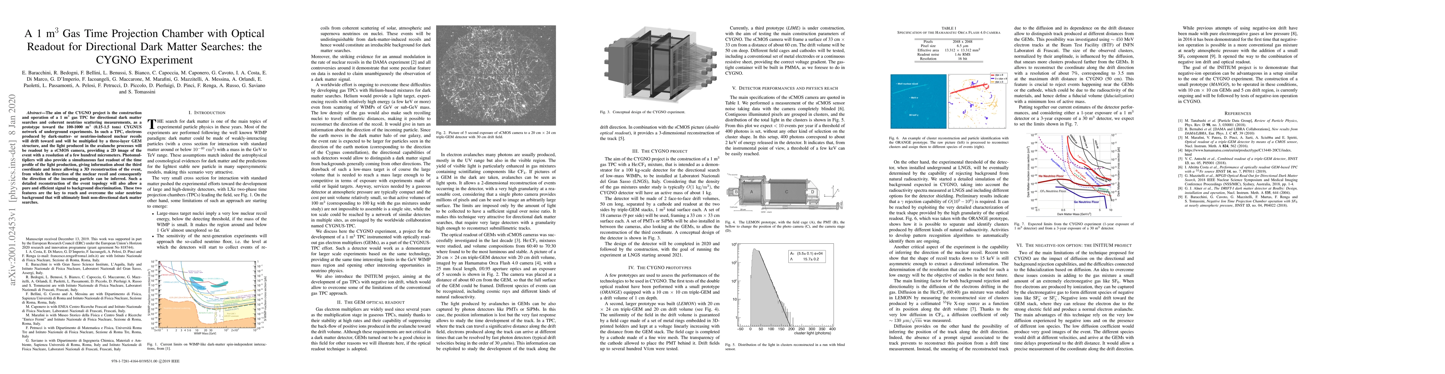 The CYGNO experiment aims to build a 1 m$^3$ gas time projection chamber with optical readout for directional dark matter searches, utilizing a three-layer GEM structure and sCMOS camera for 2D imaging and photomultipliers for 3D reconstruction. This detailed event topology enables efficient background discrimination and directionality, crucial for overcoming solar neutrino background limitations.