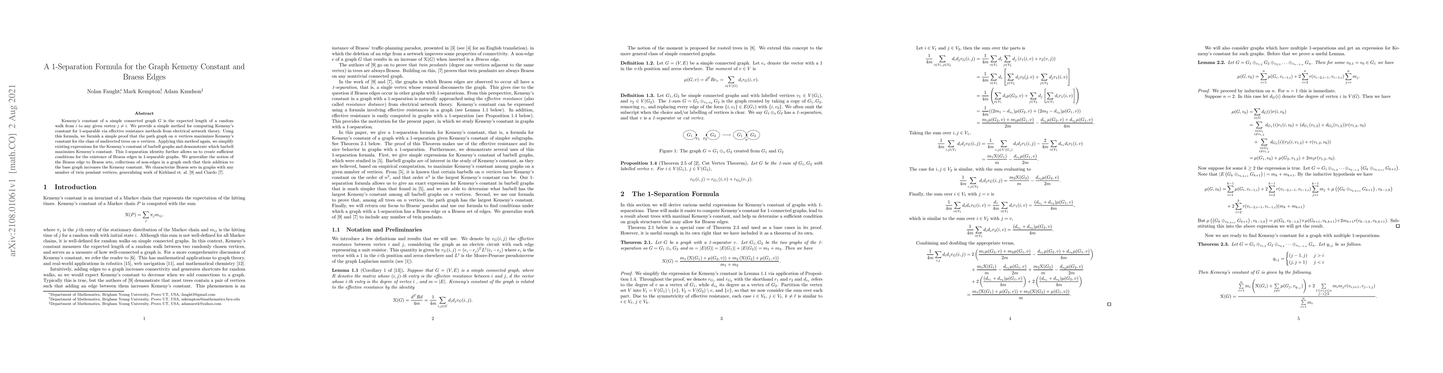 Kemeny's constant of a simple connected graph $G$ is the expected length of a random walk from $i$ to any given vertex $j \neq i$. We provide a simple method for computing Kemeny's constant for 1-separable via effective resistance methods from electrical network theory. Using this formula, we furnish a simple proof that the path graph on $n$ vertices maximizes Kemeny's constant for the class of undirected trees on $n$ vertices. Applying this method again, we simplify existing expressions for the Kemeny's constant of barbell graphs and demonstrate which barbell maximizes Kemeny's constant. This 1-separation identity further allows us to create sufficient conditions for the existence of Braess edges in 1-separable graphs. We generalize the notion of the Braess edge to Braess sets, collections of non-edges in a graph such that their addition to the base graph increases the Kemeny constant. We characterize Braess sets in graphs with any number of twin pendant vertices, generalizing work of Kirkland et.~al.~\cite{kirkland2016kemeny} and Ciardo \cite{ciardo2020braess}.